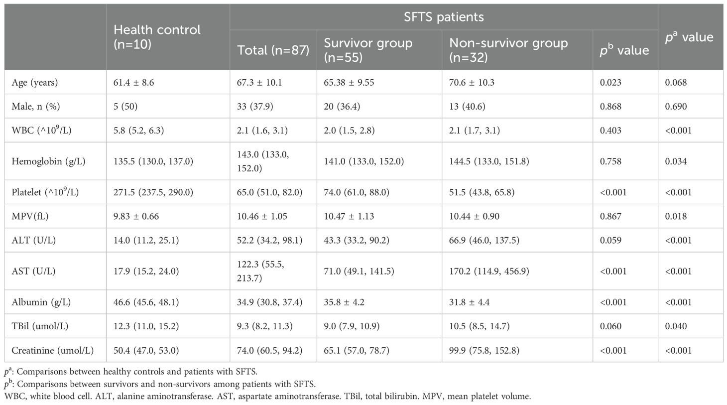 The study enrolled 87 patients with SFTS, comprising 55 survivors (SA) and 32 non-survivors (NS), along with 10 age- and sex-matched HC. The SA had an average age of 65.38 ± 9.55 years, while the NS had significantly higher age of 70.6 ± 10.3 years (p = 0.023). No significant differences in sex distribution were observed between SA and NS (p = 0.868), or between SFTS patients and HC (p = 0.690). Compared with HC, patients with SFTS had significantly lower white blood cell (WBC) counts (p < 0.001), platelet counts(p < 0.001), and albumin levels(p < 0.001), as well as higher alanine aminotransferase (ALT) (P < 0.001), aspartate aminotransferase (AST) (p < 0.001), and creatinine levels (p < 0.001). Within the SFTS cohort, NS exhibited significantly lower platelet counts (p < 0.001) and albumin levels (p < 0.001), and higher AST (p < 0.001) and creatinine (p < 0.001) compared with SA. No significant differences were found in WBC counts (p = 0.403), hemoglobin (p = 0.758), mean platelet volume (MPV) (p = 0.867), or total bilirubin (TBil) (p = 0.060) between the survivor and non-survivor groups (Table 1).
