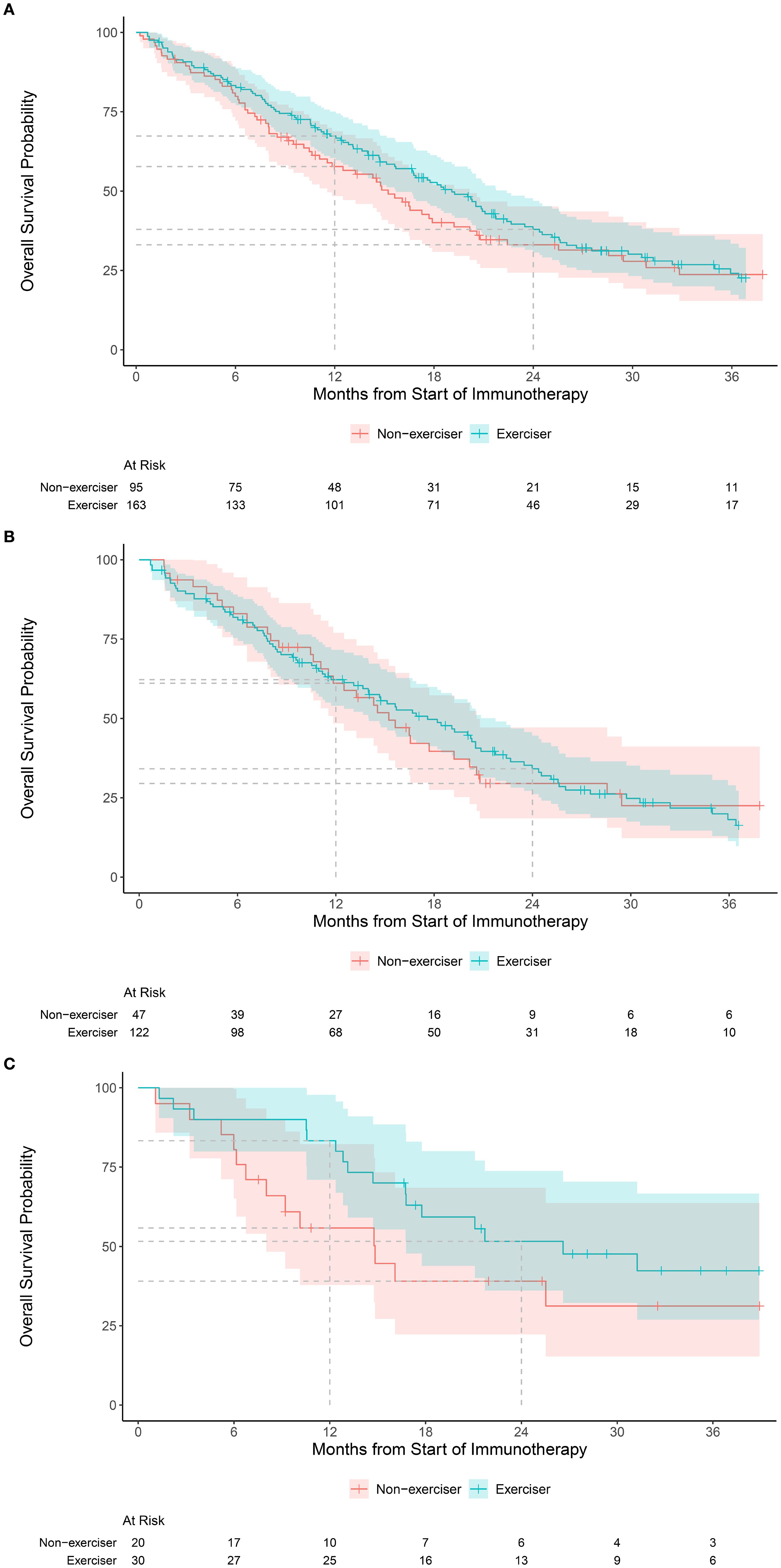 Figure 1. Kaplan-Meier estimates of overall survival in the: (A) overall cohort according to exercise status, categorized as exercisers (any moderate or vigorous exercise per week) versus non-exercise (no moderate or vigorous exercise per week), (B) Kaplan-Meier estimates of overall survival according to exercise status for tumors with low (<10 mt/mb) mutational burden, and (C) Kaplan-Meier estimates of overall survival according to exercise status for tumors with high (≥10 mt/mb) mutational burden.