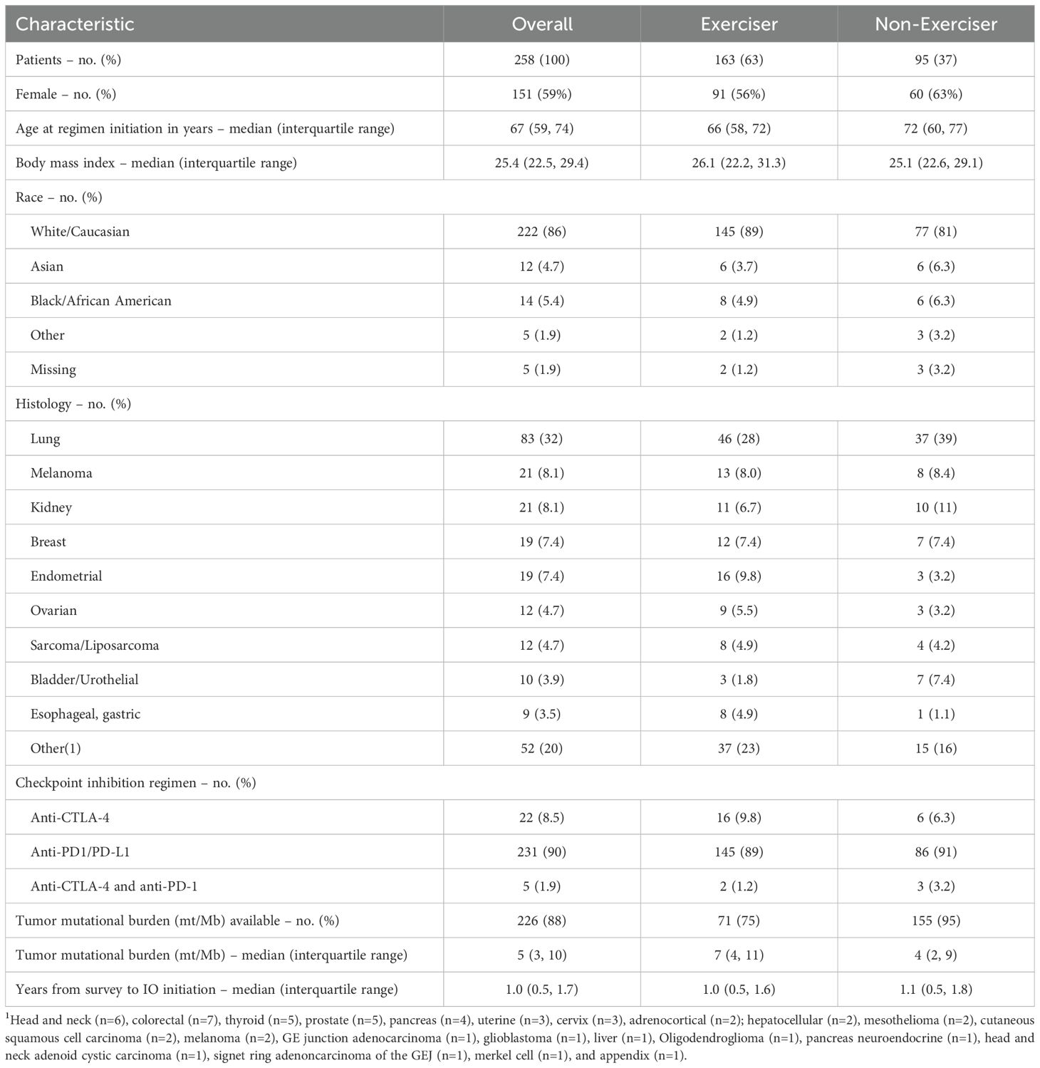 We performed a retrospective analysis of 258 patients with solid tumor malignancies receiving ICI regimens for advanced, unresectable disease with annotation of exercise within one year prior to ICI initiation at Memorial Sloan Kettering Cancer Center (Table 1). Patients receiving adjuvant ICI were excluded. Best overall response (BOR) of complete response (CR), partial response (PR), stable disease (SD), or progressive disease (PD) to ICI-containing regimen were assessed based on clinician determination of response and review of imaging. Clinical benefit (CR, PR, SD) by exercise status was evaluated using logistic regression, adjusting for sex and BMI. Overall survival (OS), defined as the time from first dose of ICI to death, was analyzed using Kaplan-Meier methods and modeled using Cox proportional hazards regression as a function of exercise status, sex and BMI.