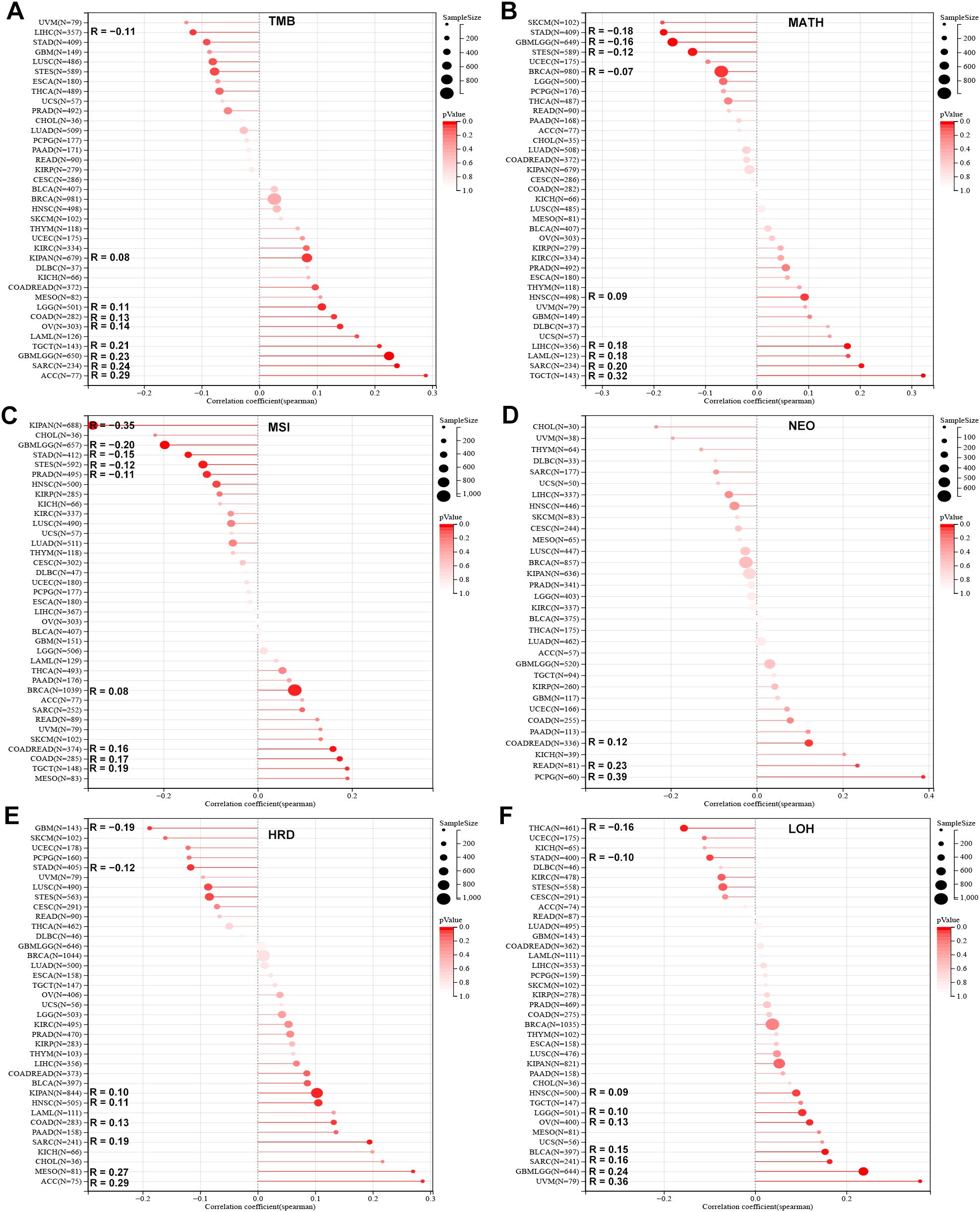 Figure 2. Association of SLC2A3 expression with genomic heterogeneity across cancers. (A) Correlation between SLC2A3 expression and tumor mutational burden (TMB) across multiple cancer types. (B) Correlation between SLC2A3 expression and mutant-allele tumor heterogeneity (MATH) across multiple cancer types. (C) Correlation between SLC2A3 expression and microsatellite instability (MSI) across multiple cancer types. (D) Correlation between SLC2A3 expression and neoantigen load (NEO) across multiple cancer types. (E) Correlation between SLC2A3 expression and homologous recombination deficiency (HRD) across multiple cancer types. (F) Correlation between SLC2A3 expression and loss of heterozygosity (LOH) across multiple cancer types.