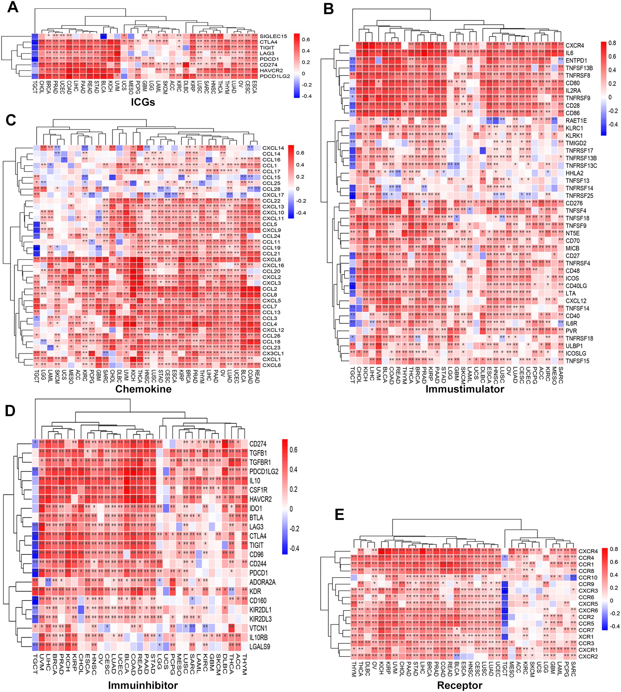 Figure 4. Association of SLC2A3 expression with immune-related genes across 33 cancer types. (A) Correlation between SLC2A3 expression and immune checkpoint genes (ICGs) across multiple cancer types. (B) Correlation between SLC2A3 expression and immunostimulatory genes across multiple cancer types. (C) Correlation between SLC2A3 expression and chemokine genes across multiple cancer types. (D) Correlation between SLC2A3 expression and immunoinhibitory genes across multiple cancer types. (E) Correlation between SLC2A3 expression and receptor genes across multiple cancer types.