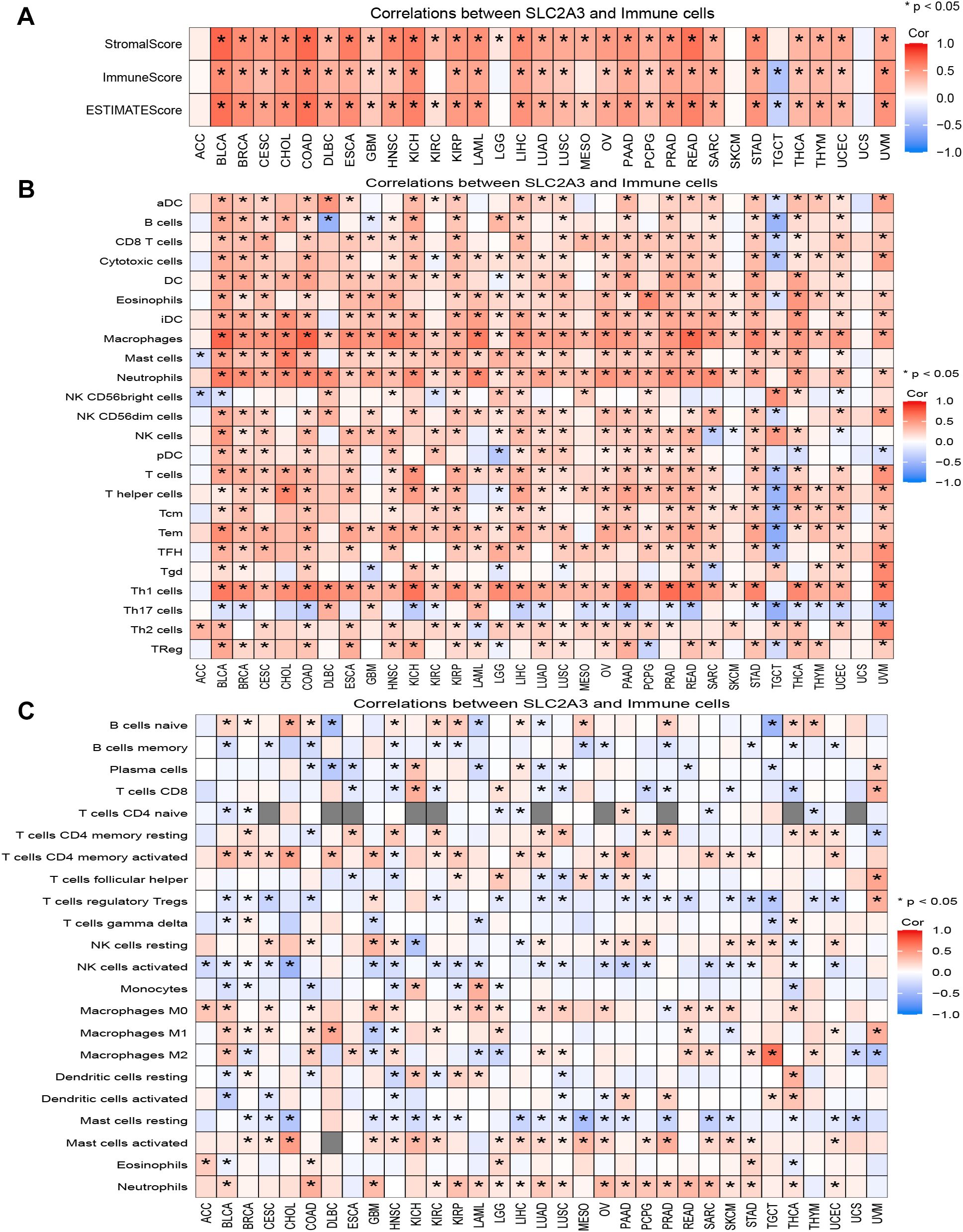 Figure 5. Association of SLC2A3 expression with the tumor immune microenvironment across cancers. (A) Correlation between SLC2A3 expression and StromalScore, ImmuneScore, and ESTIMATEScore across multiple cancer types. (B) Correlation between SLC2A3 expression and immune cell infiltration estimated by ssGSEA across multiple cancer types. (C) Correlation between SLC2A3 expression and immune cell infiltration estimated by CIBERSORT across multiple cancer types.
