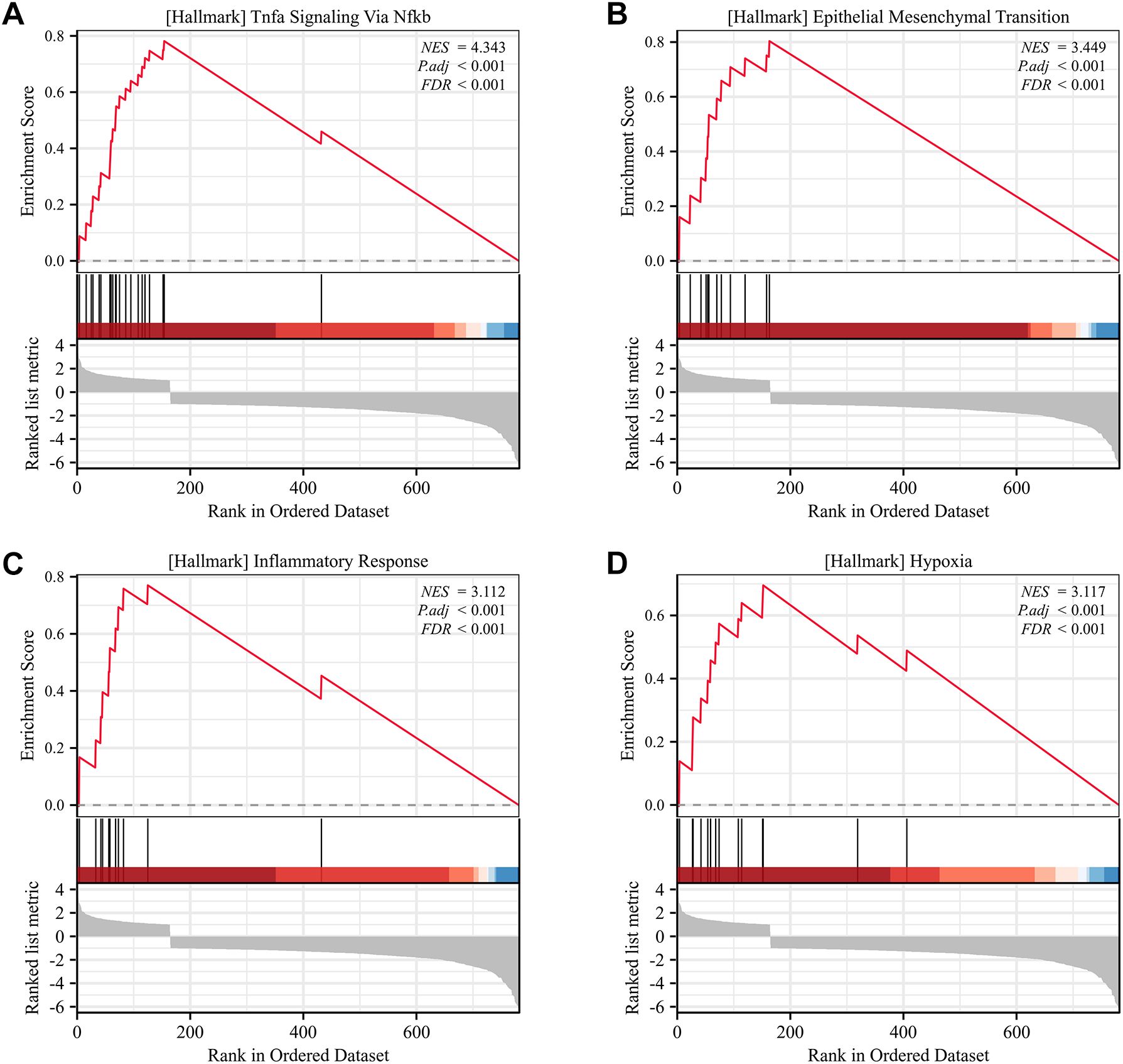 GSEA identified four hallmark pathways with significant enrichment. Specifically, Figure 7A shows enrichment of the TNFα signaling via NF-κB pathway, Figure 7B shows enrichment of epithelial-mesenchymal transition (EMT), Figure 7C shows enrichment of inflammatory response, and Figure 7D shows enrichment of the hypoxia pathway.