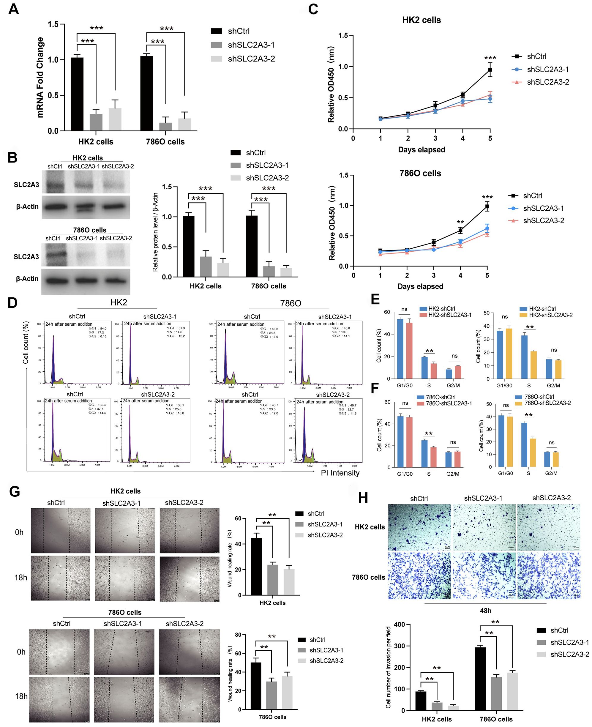 To explore the function of SLC2A3, functional experiments were conducted in HK-2 and 786-O cells, with knockdown verified by RT-qPCR and Western blotting (Figures 8A, B). Suppression of SLC2A3 significantly inhibited cell proliferation, as shown by CCK-8 assays (Figure 8C), and reduced the proportion of cells in S phase according to flow cytometry analysis (Figures 8D–F). Additionally, wound healing assays demonstrated markedly impaired migratory capacity in both cell lines following SLC2A3 knockdown (Figure 8G), which was further supported by decreased migration in Transwell assays (Figure 8H). HK-2 cells served as non-malignant renal tubular controls to provide a physiological context for tumor-specific alterations observed in 786-O cells, reflecting the properties of normal proximal tubular epithelium.