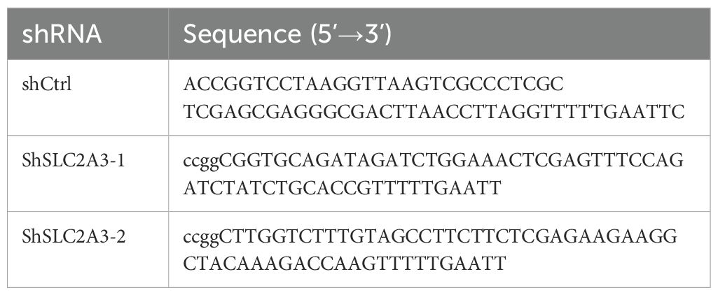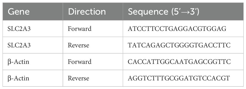 Cells were disrupted on ice with RIPA buffer (Beyotime) supplemented with 1 mM PMSF and protease inhibitors. Protein concentrations were measured with a BCA assay kit (Beyotime). Equal amounts of protein (20–30 µg) were separated by 10% SDS-PAGE and transferred onto PVDF membranes. Membranes were blocked with 5% non-fat milk in TBST for 1 h at room temperature, then incubated overnight at 4 °C with primary antibodies against SLC2A3 (1:1000, #A5515, Selleck) and β-Actin (1:5000, #20536-1-AP, Proteintech). Following washing, membranes were exposed to HRP-labeled secondary antibodies (1:5000) for 1 h at room temperature, and protein signals were visualized using an ECL detection kit (Thermo Fisher).