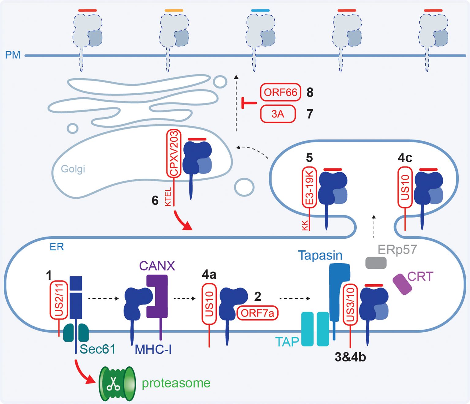 Figure 3. Viral interference with the HLA class I HC and transport. (1) HCMV US2 or US11 form a complex with the HC and target it for proteasomal degradation in the cytoplasm. (2) SARS-CoV-2 ORF7a mimics β2m and competes for HC binding. (3) HCMV US3 retains HLA class I in the ER trough tapasin binding. (4) HCMV US10 binds all HLA class I HCs (a) but only prevents β2m:HLA-B from interacting with the PLC (b) and interacts with selected β2m:HLA-C causing ER retention (c). (5) Adenovirus E3-19K retains HLA class I in the ER using a dilysine motif. (6) Cowpoxvirus CPXV203 has a C-terminal KTEL motif that is recognised by the cellular KDEL pathway for protein retrieval from the Golgi back to the ER. (7) Poliovirus and coxsackievirus B3 proteins 3A disrupt the Golgi and interfere with HLA class I trafficking. (8) VZV ORF66 retains HLA class I molecules in the Golgi.