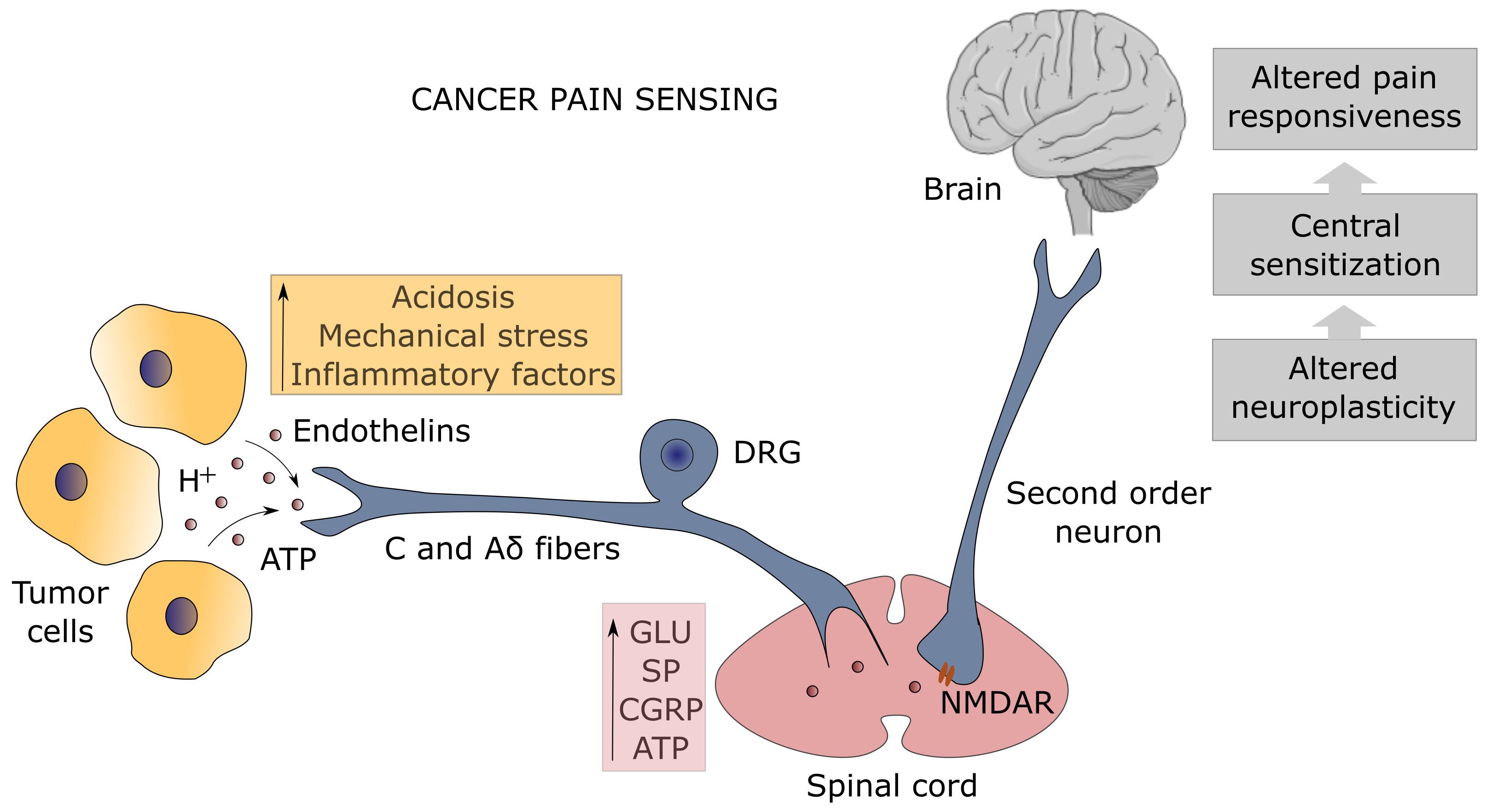 Figure 1. Mechanism of pain sensing at the tumor-nociceptor interface. The unmyelinated C and thinly-myelinated Aδ fibers which represent the primary afferent sensory nerves (known as nociceptors) detect many types of noxious stimuli from tumor cells (orange box). Protons (H+) are sensed by the transient receptor potential vanilloid-1 (TRPV1) channel and the acid-sensing ion channel-3 (ASIC3), adenosine triphosphate (ATP) by the purinergic P2X3 receptor, endothelins by the endothelin-A receptor, whereas the dorsal-root acid-sensing ion channel (DRASIC) detects the mechanical distension of sensory fibers caused by tumor growth. Activation of nociceptors, whose cell bodies lie in the dorsal root ganglia (DRG), results in the release of neurotransmitters (pink box), such as glutamate (Glu), substance P (SP), calcitonin gene-related peptide (CGRP), and ATP, which transmit the painful signal in the spinal cord to the second order neurons expressing the N-methyl-D-aspartate receptor (NMDAR), leading to spinal cord and brain sensitization with altered pain responsiveness (gray boxes).