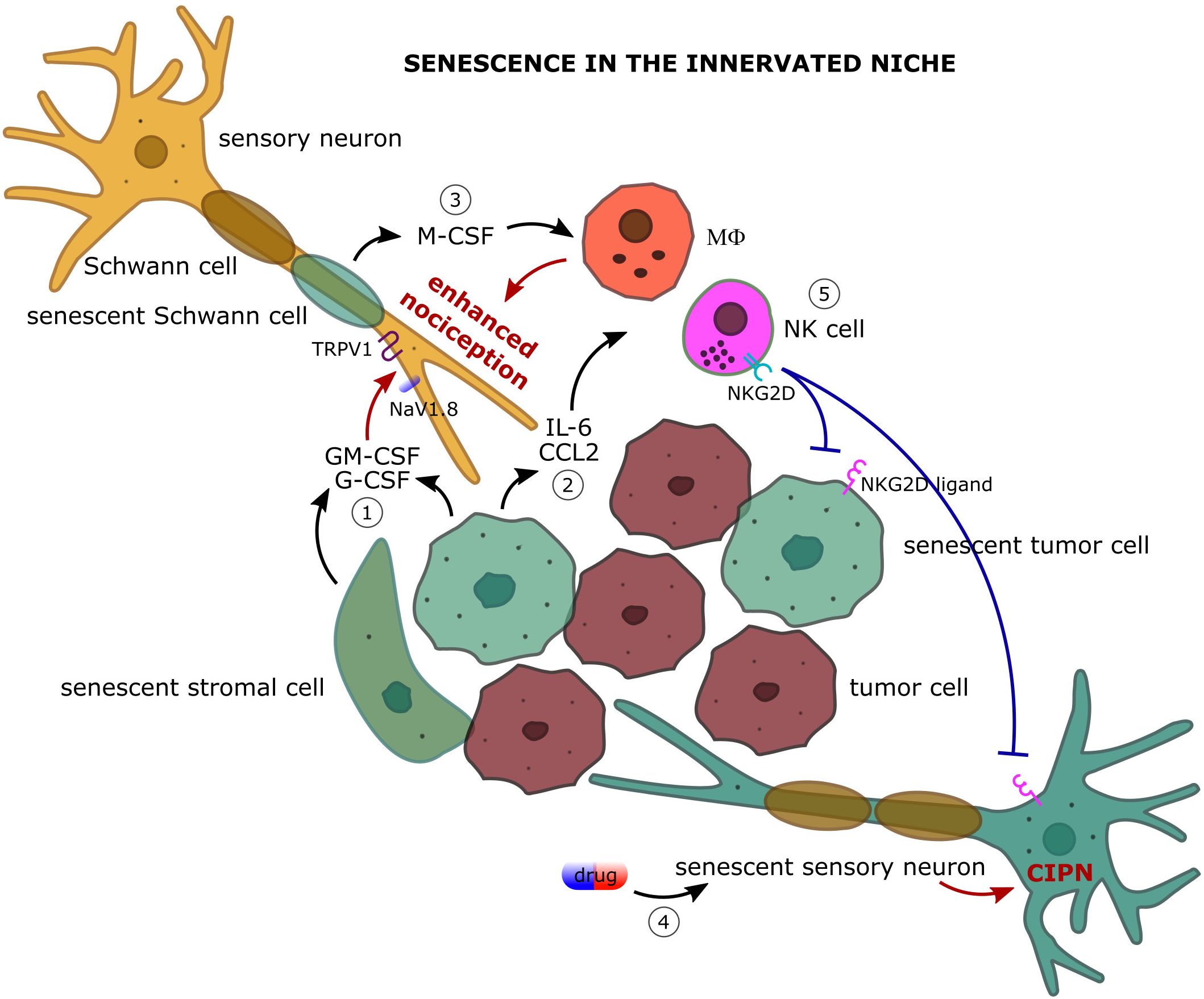 Figure 2. The complex dialog among the actors of the innervated niche: focus on how cellular senescence impacts on cancer-associated pain. 1) Senescent tumor and stromal cells secrete large amount of granulocyte colony stimulating factor (G-CSF) and granulocyte-macrophage colony stimulating factor (GM-CSF) which upregulate the expression of the sodium channel NaV1.8 and the heat-activated channel TRPV1 on primary afferent nociceptors leading to enhanced pain perception upon nociceptive stimulation. 2) Senescent cells are a robust source of inflammatory cytokines (e.g. IL-6) and chemokines (e.g. CCL2) and actively recruit immune cells, such as macrophages (MΦ) and natural killer (NK) cells, in the innervated niche. Macrophage-promoted inflammation and oxidative stress strongly sensitize nociceptive nerves leading to enhanced nociception. 3) Senescent Schwann cells contribute to the recruitment and proliferation of the macrophage population in the innervated niche by producing the macrophage colony stimulating factor (M-CSF). 4) Senescence of sensory neurons following chemotherapy can participate in the pathogenesis of chemotherapy-induced peripheral neuropathy (CIPN). 5) Senescence-attracted NK cells target both tumoral and neuronal senescent cells through NKG2D/NKG2D ligand interaction providing an immune cell-mediated mechanism of pain control.