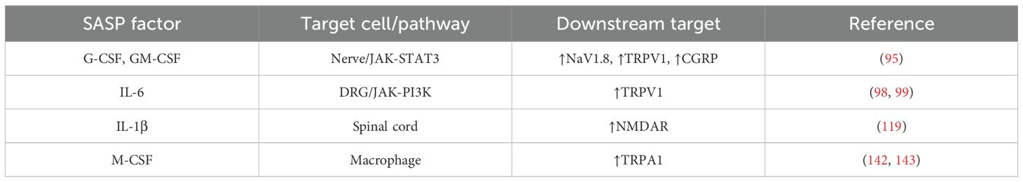 SASP composition is extremely heterogeneous and dynamic, depending on cell type and cause of senescence (92–94). Nevertheless, some factors are shared among the conditions and are discussed below regarding their capacity to affect cancer-evoked pain (Table 1).