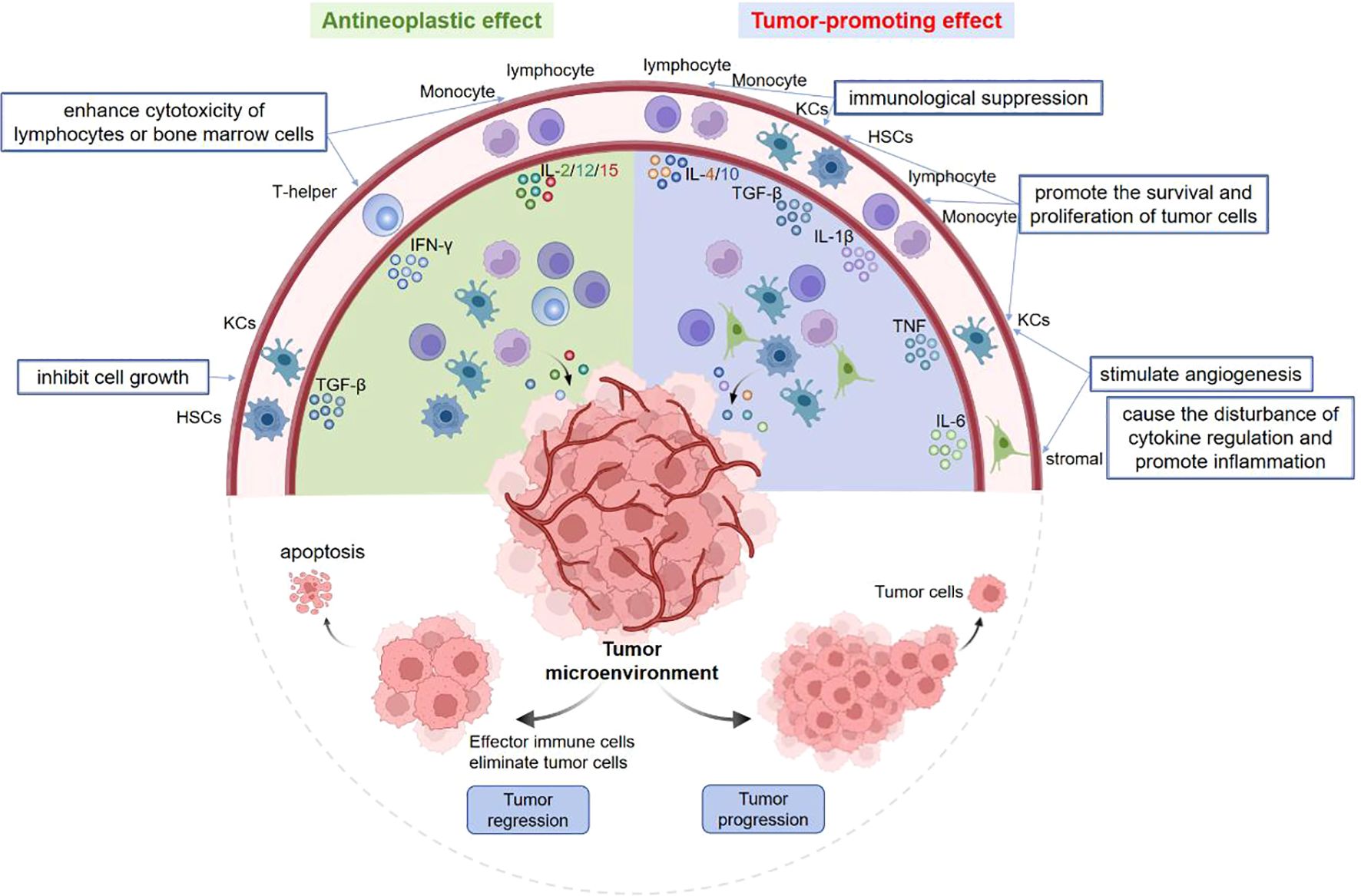 Some cytokines have antineoplastic and/or tumor-promoting effects. On the one hand, TGF-β can inhibit tumor cell growth, IFN-γ and IL-2/12/15 suppress cell proliferation by enhancing the cytotoxicity of lymphocytes or bone marrow cells. On the other hand, TGF-β, TNF, IL-1β promote tumor cell proliferation. TNF and IL-6 can stimulate the angiogenesis, disturb cytokine regulation and trigger inflammation. Moreover, IL-4/10 and TGF-β can induce the immunosuppression.