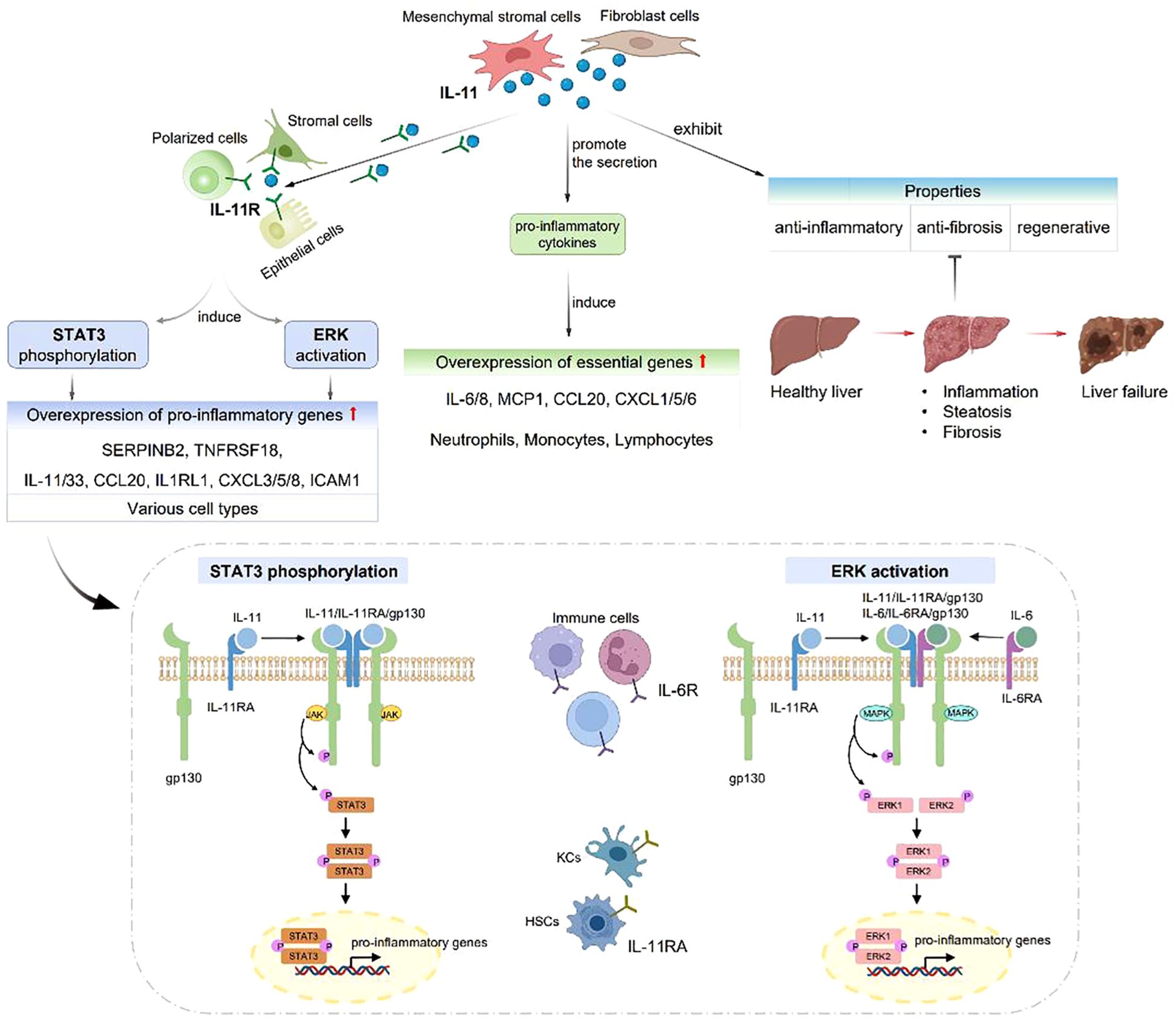 IL-6R is expressed in immune cells, while IL-11R is expressed in stromal, epithelial and polarized cells. IL-11 can cause liver inflammation, steatosis, fibrosis and liver failure. IL-11 induces STAT3 phosphorylation and ERK activation, resulting in SERPINB2, TNFRSF18, IL-33, CCL20, IL1RL1, CXCL3/5/8, ICAM1 and IL-11 overexpression. IL-11 can also promote the secretion of IL-6, IL-8, MCP1, CCL20 and CXCL1/5/6.