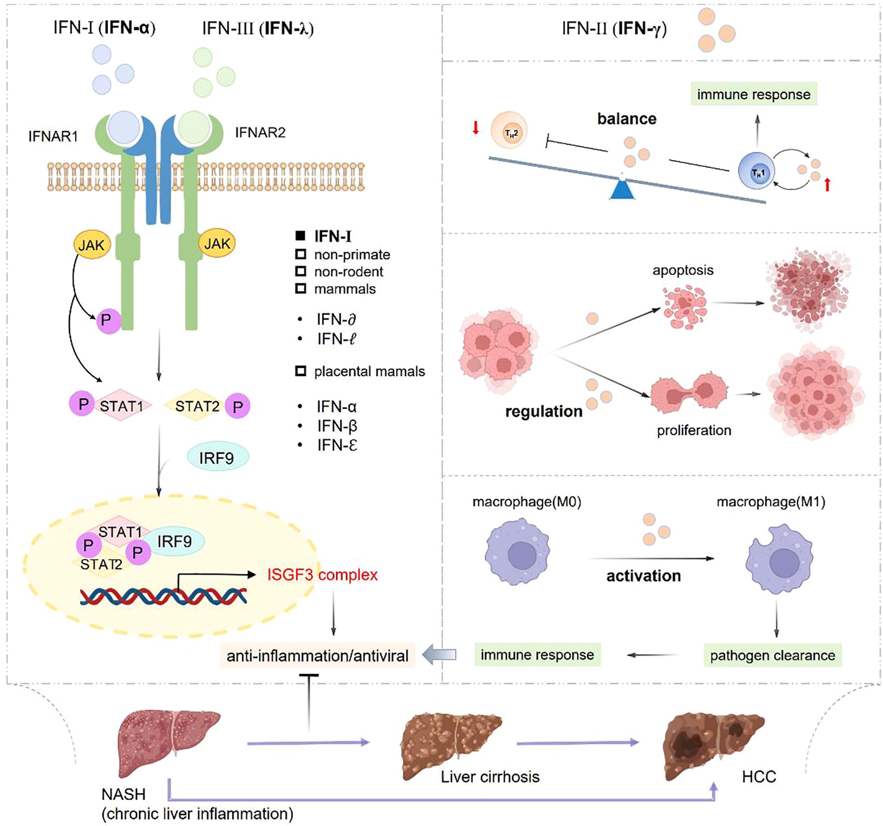 Type I and type III IFNs have unique ability to activate the STAT. leading to STAT1/STAT2 heterodimer formation, then interacting with IFN regulatory factor 9 (IRF9) to assemble into IFN-stimulated gene factor 3 (ISGF3) (110). NAFLD and non-alcoholic steatohepatitis (NASH) are significant challenges threatening human health due to their increasing incidence and prevalence. Studies have demonstrated that IRFs are important molecules involved in triggering IFN transcription, which play a critical role in the pathogenesis of NAFLD/NASH (111).