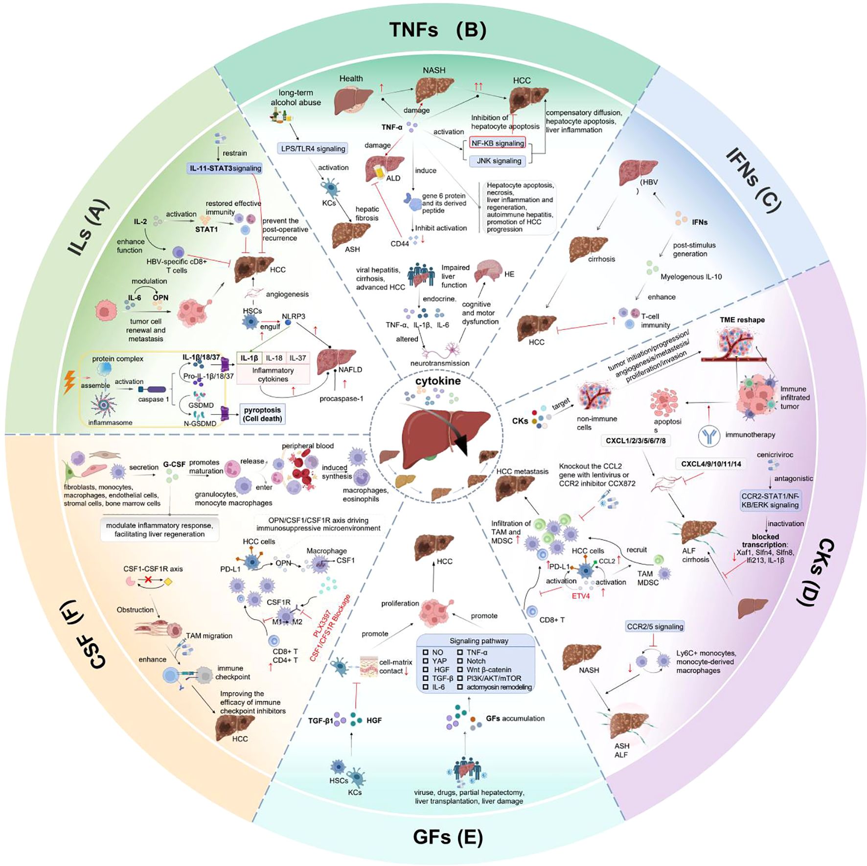 Figure 4. Pivotal role of cytokines in liver disease pathogenesis and clinical application. (A) IL-2 can activate STAT1 signaling, restore effective immune and enhance HBV-specific CD8+ T cells. IL-6 impacts tumor cell renewal and metastasis by modulating OPN. The postoperative recurrence of HCC can be prevented by constraining IL-11-STAT3 signaling. HSCs engulf NLRP3, enhance IL-1β expression, cause liver injury, fibrosis and HCC. (B) TNF-α affects liver inflammation, apoptosis by activating NF-κB and JNK pathways. HE is appeared in patients with acute or subacute liver injury, cirrhosis and advanced HCC. (C) IFNs can suppress HBV replication, reduce liver inflammation, prevent disease progression by stimulating myeloid-derived IL-10 expression and enhancing immune response. (D) CKs promote tumor initiation, progression, angiogenesis, metastasis, proliferation and invasion by targeting the non-immune cells and reshaping the TME. ETV4 overexpression in hepatocytes can activate PD-L1 and CCL2, increase TAM and MDSC infiltration, inhibit CD8+T cell accumulation, then promote HCC metastasis. (E) When liver function is damaged by viruses, drugs, as well as after partial hepatectomy or liver transplantation, Liver regeneration occurs with GFs accumulation and extracellular environment remodeling through activating pathways including NO, YAP, actomyosin remodeling, IL-6, TNF-α, Notch, Wnt/β-catenin, HGF, TGF-β and PI3K/AKT/mTOR pathways. (F) G-CSF is secreted by fibroblasts, monocytes, macrophages, endothelial cells, stromal cells and bone marrow cells. It can induce macrophages and eosinophils synthesis, regulate inflammatory response and enhance liver regeneration. OPN/CSF1/CSF1R axis has immunosuppress property in HCC microenvironment.