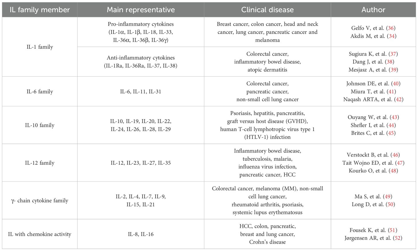 Based on the recognition sequence homology and receptor chain similarity of interleukins, they’re divided into different families and exert important effects in inflammation, autoimmune diseases and cancers (34, 35) (Table 1). IL-1 and IL-6 family members are introduced detailedly in this review. IL-1 family consists of three main types: agonists (IL-1α, IL-1β, IL-18, IL-33, IL-36α, IL-36β and IL-36γ), antagonists (IL-1Ra, IL-36Ra and IL-38) and anti-inflammatory cytokine (IL-37) (53). They serve as crucial signaling molecules in both innate and adaptive immune systems, mediating the inflammatory responses to varieties of stimuli (54). The high-resolution structures of IL-1α, IL-1β, IL-1Ra, IL-18, IL-33, IL-36γ, IL-37 and IL-38 have been determined by X-ray crystallography or solution nuclear magnetic resonance (NMR). All of them have conserved β-trilobate conformation and a hydrophobic core consisting of 12β-sheets (55). In the context of tumor development and therapy, IL-1 expression is differentially regulated in tumor cells, tissue stromal cells and immune cells in a stage-specific and tissue-specific manner. IL-1 family members and their receptors have pleiotropic functions depending on the target cells, playing complicated roles in inflammation, tumorigenesis, tumor metastasis, immunosuppression and immune surveillance (56). IL-1 signaling regulation lies on IL-1R1 and IL-1R2. IL-1R1 is involved in the differentiation, expansion and survival of Th17 cells, as well related to autoimmune disease (57). Most IL-1 family members form into signaling complexes by binding to their homologous receptors, such as IL-1RI (IL-1α and IL-1β), IL-33R (ST2) and IL-36R (IL-36α, IL-36β and IL-36γ). IL-1 receptor accessory protein (IL-1RAcP) commonly serves as shared secondary receptor, facilitating the formation of cytokine-receptor co- receptor complexes. Therefore, targeting to the IL-1RAcP can selectively inhibit the signaling transduction mediated by IL-1 family members, which provides a potential strategy for treating cancers (58).