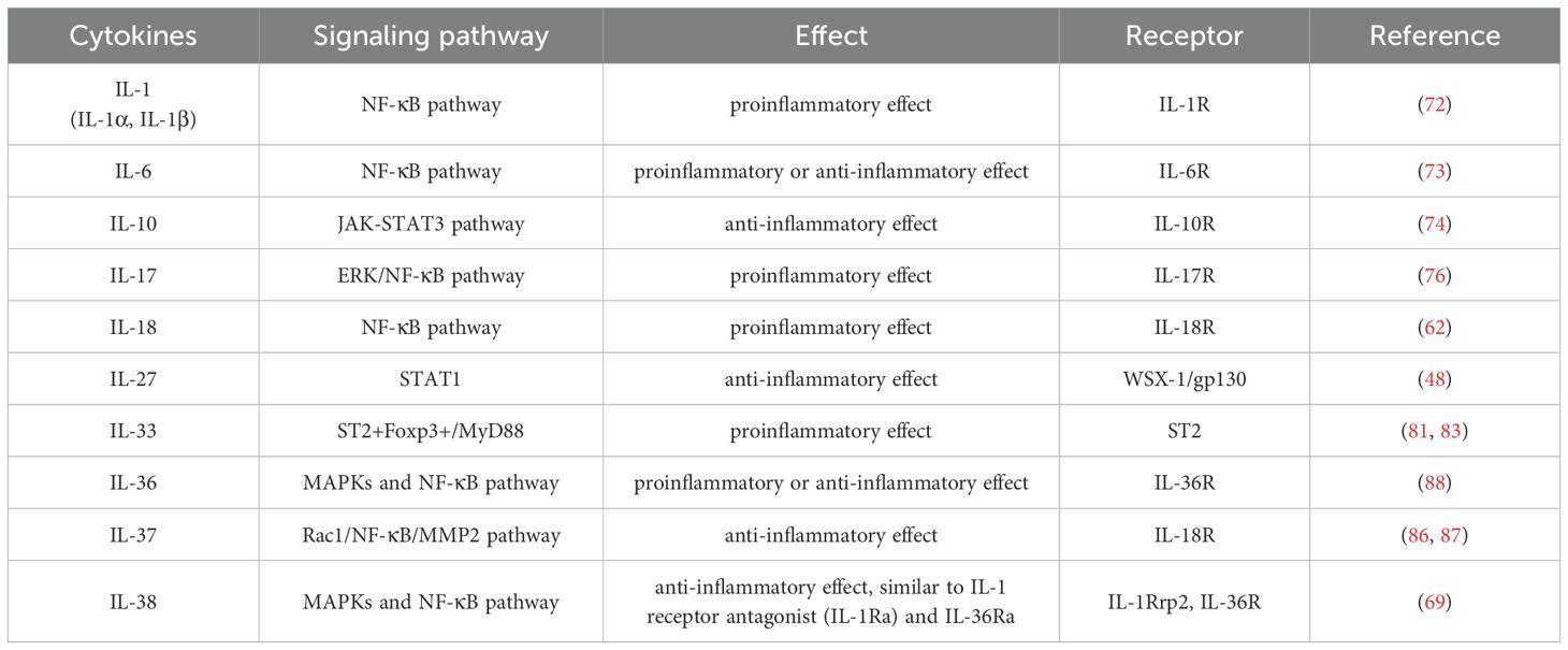 IL-1 superfamily members including IL-1α, IL-1β, IL-18, IL-36α, IL-36β, IL-36γ and IL-38, which play vital roles in inflammation, immunity and cancers. In synergy with IL-36Ra, IL-36 promotes the intestinal inflammation through the NF-KB pathway, which maintains the homeostasis by balancing the pro- and anti-inflammatory responses in the TME (88). IL-38 also exhibits anti-inflammatory property of decreasing IL-6, IL-1β, CCL5 and CXCL10 expression, reducing the production of pro-inflammatory mediators including IL-17 and IL-22 (89, 90), which is considered as a receptor antagonist in inhibiting IL-36 to bind to IL-36R (69). ILs play a crucial part in disease progression, which possess pro- or anti-inflammatory properties by mediating various signaling pathways (Table 2). However, further researches are needed to confirm these effects.