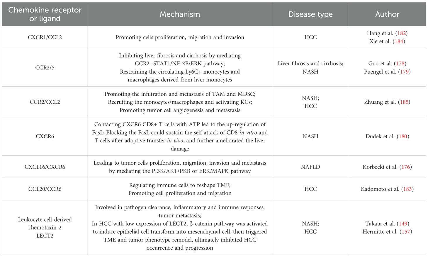 Excessive alcohol consumption, a high-fat diet, and chronic hepatitis virus infection can lead to liver inflammation, eventually cause portal hypertension, liver fibrosis, cirrhosis, HCC. Endothelial p300 is a regulator of gene transcription with the properties of activating NF-κB pathway, promoting CCR2+ monocytes/macrophages accumulation and increasing CCL2 expression in the damaged liver, ultimately resulting in portal hypertension and liver fibrosis (177). Guo et al. (178) discovered that cenicriviroc could inhibit liver fibrosis and cirrhosis by inactivating CCR2-STAT1/NF-κB/ERK pathway. Puengel et al. (179) demonstrated that CCR2/5 signaling ameliorated liver fibrosis through inhibiting the monocytes and macrophages. Dudek et al. (180) showed that CXCR6+ CD8 T cells were abundant in NASH, characterized by low-activity transcription factor forkhead box O1(FOXO1). Fas and its ligand FasL were related to cell apoptosis. Blocking the FasL could prevent self-attack of CD8 in vitro and T cells after adoptive transfer in vivo, which further improved the liver injury in NASH.