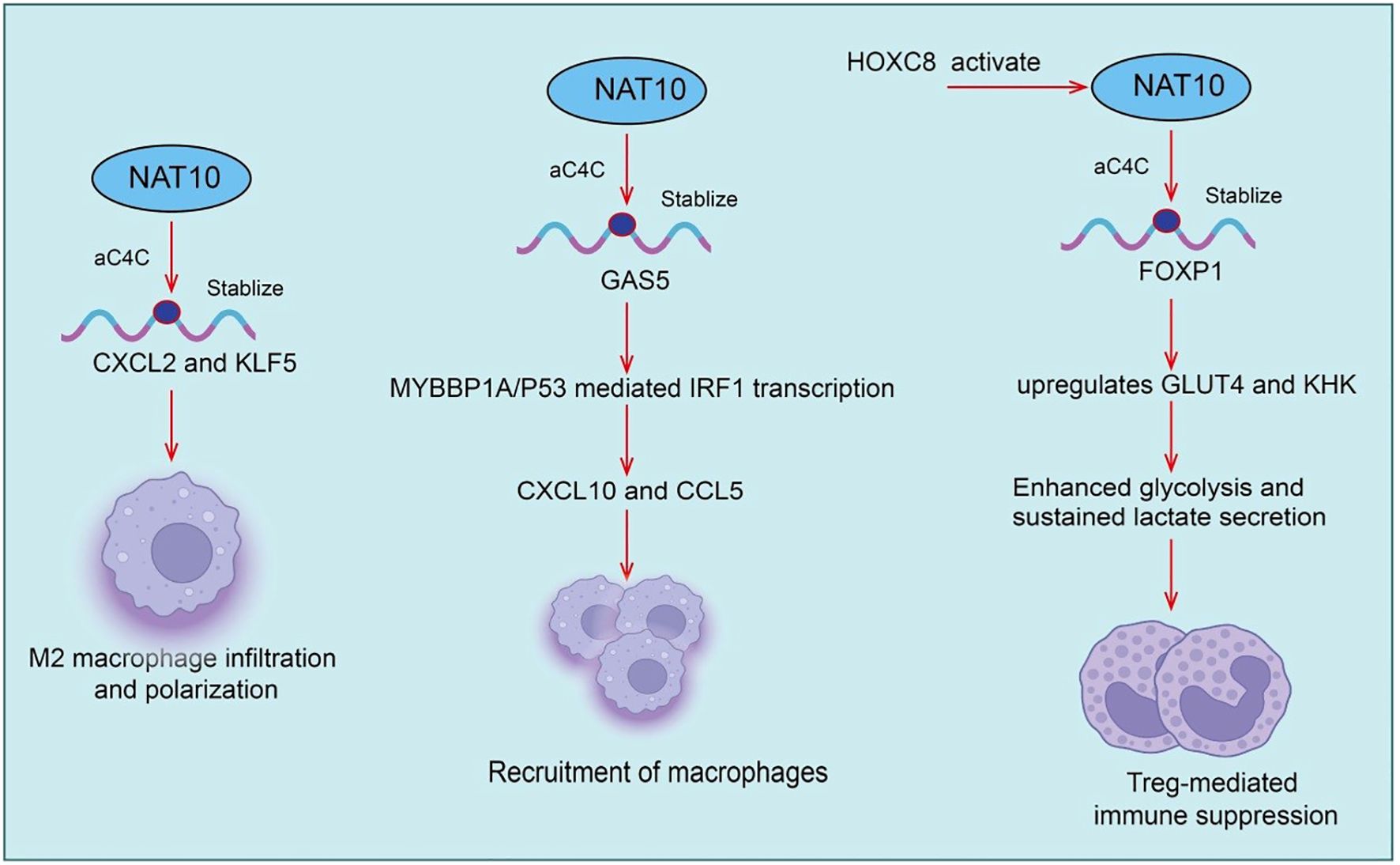 Tumor-associated macrophages (TAMs) are among the most abundant immune cell populations within the tumor microenvironment (TME) and play critical roles in tumor growth, invasion, angiogenesis, and immunosuppression (29–31). TAMs typically exhibit an M2-like phenotype, secreting pro-tumorigenic factors such as VEGF, TGF-β, and IL-10, thereby suppressing effector T cell function and promoting immune evasion and tumor progression (32–34). Recent studies have shown that in hepatic metastatic gastric cancer (GC) cells, the RNA acetyltransferase N-acetyltransferase 10 (NAT10) is aberrantly overexpressed. Specifically, NAT10-mediated N4-acetylcytidine (ac4C) modification enhances the stability of CXCL2 and KLF5 mRNAs. The secreted CXCL2 subsequently promotes M2 macrophage infiltration and polarization, and through oncostatin M production, activates the STAT3 signaling pathway, transcriptionally upregulating NAT10 expression and forming a positive feedback loop (35). Similarly, in prostate cancer, NAT10 is significantly upregulated, enhancing tumor cell proliferation and invasion. Mechanistically, NAT10 suppresses CD8+ T cell recruitment and cytotoxicity via the CCL25/CCR9 axis, thereby establishing an immunosuppressive microenvironment that promotes tumor progression (36). Notably, ac4C modification scores based on NAT10 downstream targets can predict immune infiltration levels and response to immunotherapy, providing a potential tool for patient stratification(Figure 2).