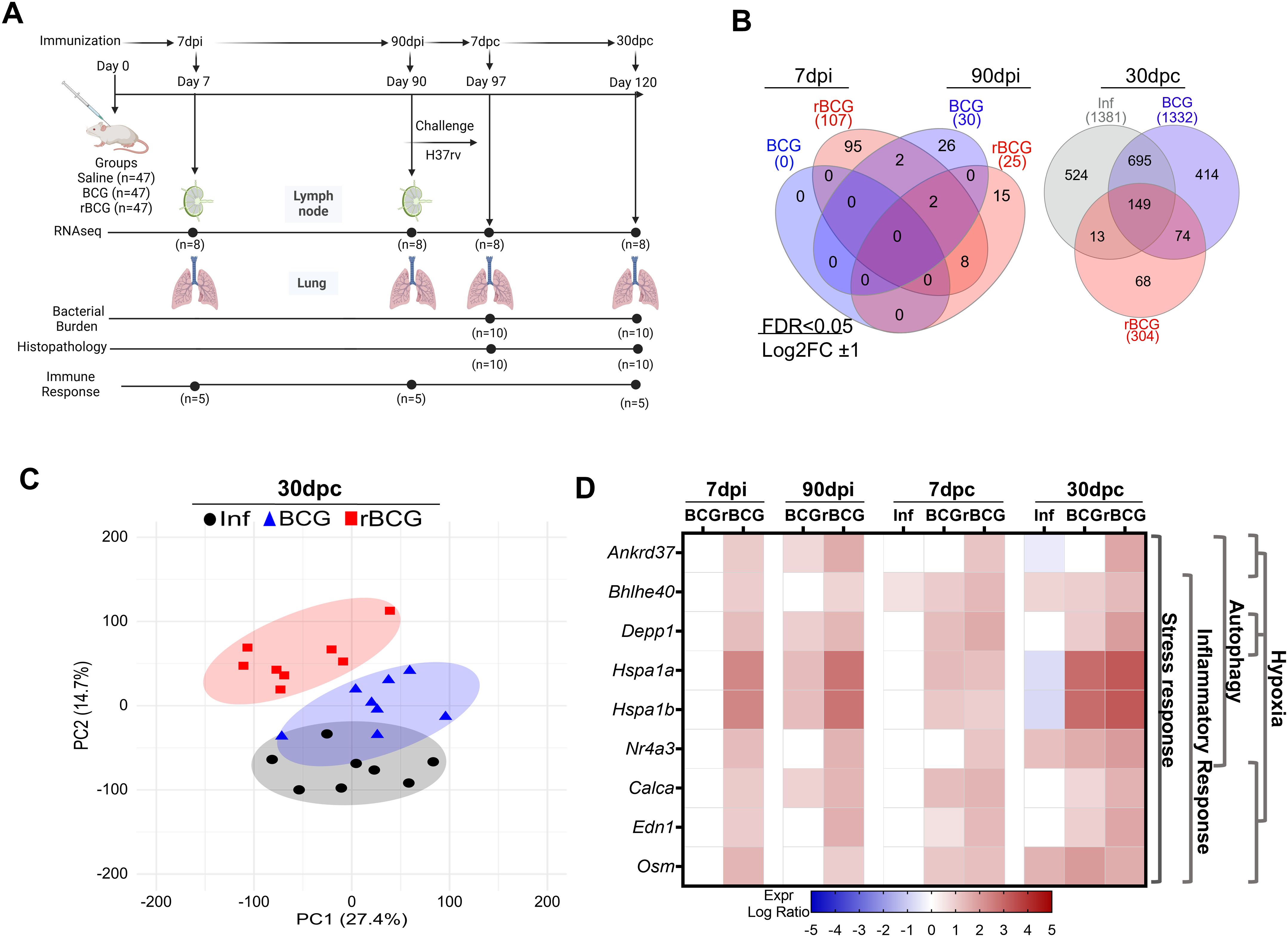 Figure 1. Immunization of mice with BCG or rBCG-LTAK63 induces distinct gene expression patterns. (A) Experimental design illustrating the distribution of groups, the time intervals, and the analysis performed. BALB/c mice were immunized with either BCG or rBCG-LTAK63 (rBCG); lymph nodes and lungs were collected at 7- and 90-dpi for RNA-seq transcriptome analysis. At 7- and 30-dpc, lungs were collected for RNA-seq, bacterial burden and histopathology assessments. Parallel groups of animals were used to evaluate immune responses at the same time points. (B) Venn diagrams depict the shared and unique genes expressed in the lungs of BCG or rBCG-immunized mice before (7 and-90-dpi) and after challenge (30-dpc). Differences were considered statistically significant with adjusted P < 0.05 and absolute log2FC >1 in DESeq2; only statistically significant data are presented. (C) Unsupervised principal components analysis of gene variation of all samples at 30-dpc. PCA displays components 1 (PC1) and 2 (PC2), indicating the percentage of variation in gene expression represented in each component. Dots represent individual lung samples: Infection only (Inf, n=8, black circles); BCG-immunized/challenged (BCG, n=8, blue triangles); rBCG-LTAK63-immunized/challenged (rBCG n=8, red squares) (D) Expression profile and associated functions of the nine genes detected as DEGs at all time points in rBCG-LTAK63-immunized/challenged animals in comparison with the BCG and Inf control groups. The color represents the log2 Fold Change (FC). Expression was considered significant when P < 0.05 and absolute log2FC >1). The side dendrogram presents the gene functions with the highest scores from the over-representation analysis.