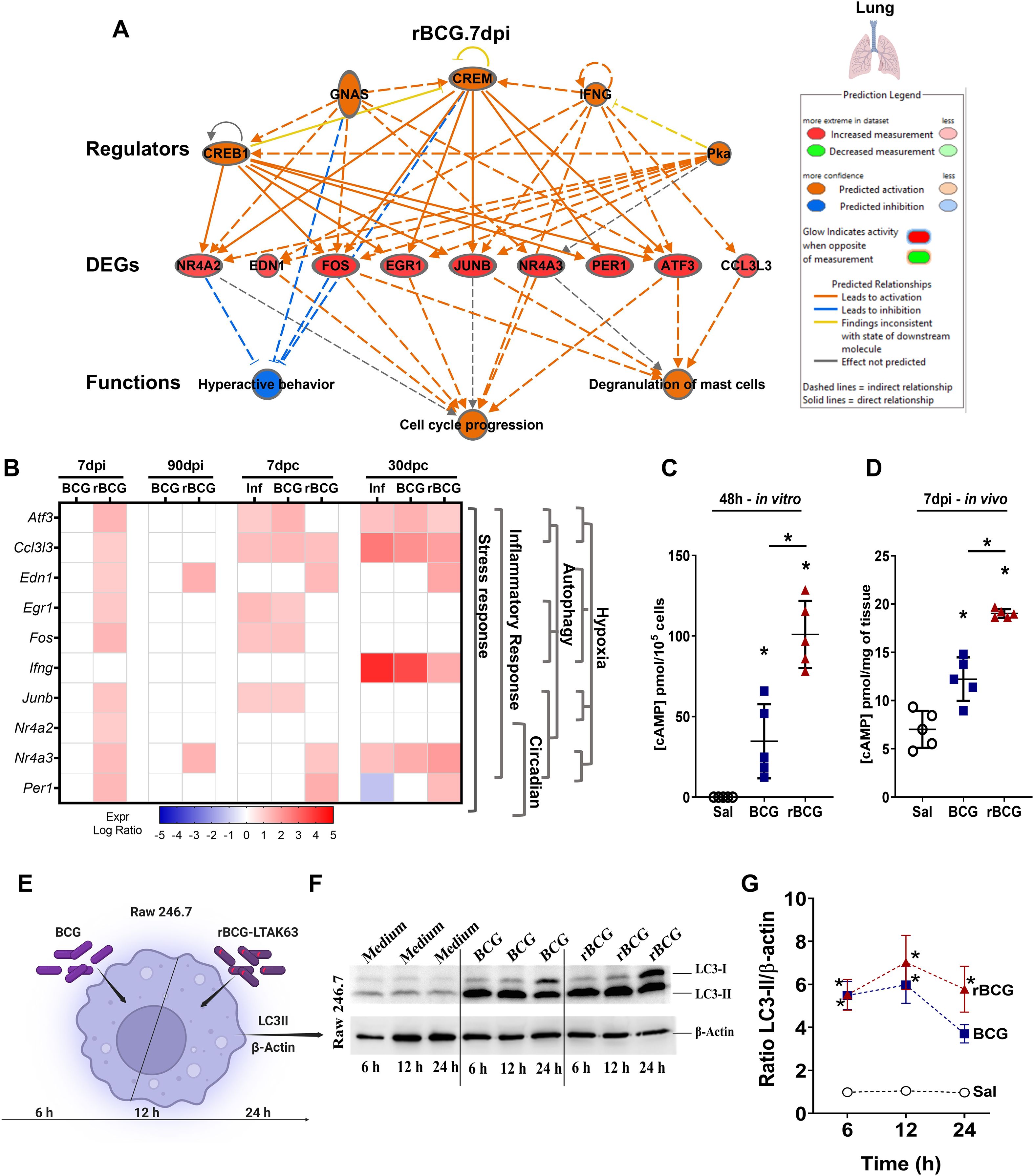 Figure 2. Early effect of rBCG-LTAK63 in the lungs of immunized animals suggests upregulation of cAMP-dependent genes and autophagy pathway. (A) IPA regulator effect diagram illustrating the correlation between DEGs at 7dpi, their predicted regulators and functions (P value<0.05, absolute Log2FC>1). Red symbols indicate upregulated genes, orange symbols are regulators or functions predicted to be upregulated, and blue symbols are predicted as downregulated. (B) Heatmap displaying the top genes identified in the regulator effects across different groups and time points (P value<0.05, absolute Log2FC > 1). The side dendrogram presents the gene functions with the highest scores from the over-representation analysis. (C) Quantification of cAMP in lung cells in vitro upon 48h of stimulation with BCG or rBCGLTAK63. (D) Quantification of cAMP levels in lung tissue from mice immunized with BCG or rBCG-LTAK63 at 7-dpi (n=5). (E) Experimental scheme of induction of autophagy in macrophages (RAW246.7 macrophage-like mouse cells) exposed in vitro to BCG or rBCG-LTAK63 (MOI 10:1). (F) RAW246.7 cells were collected at 6, 12, and 24h after stimulation, and evaluated for the conversion from LC3-I to LC3-II by Western blotting. (G) Saline (Sal), BCG and rBCG-LTAK63-induced autophagy in the RAW246.7 cells was evaluated as the ratio between LC3-II and β-actin, using densitometry analysis in ImageJ software (n=3/time point). Data shows mean values ± SD. An asterisk (*) above a group indicates a significant difference compared to the Inf (control) group (P < 0.05, one-way ANOVA). An asterisk with a horizontal bar denotes a significant difference between groups.