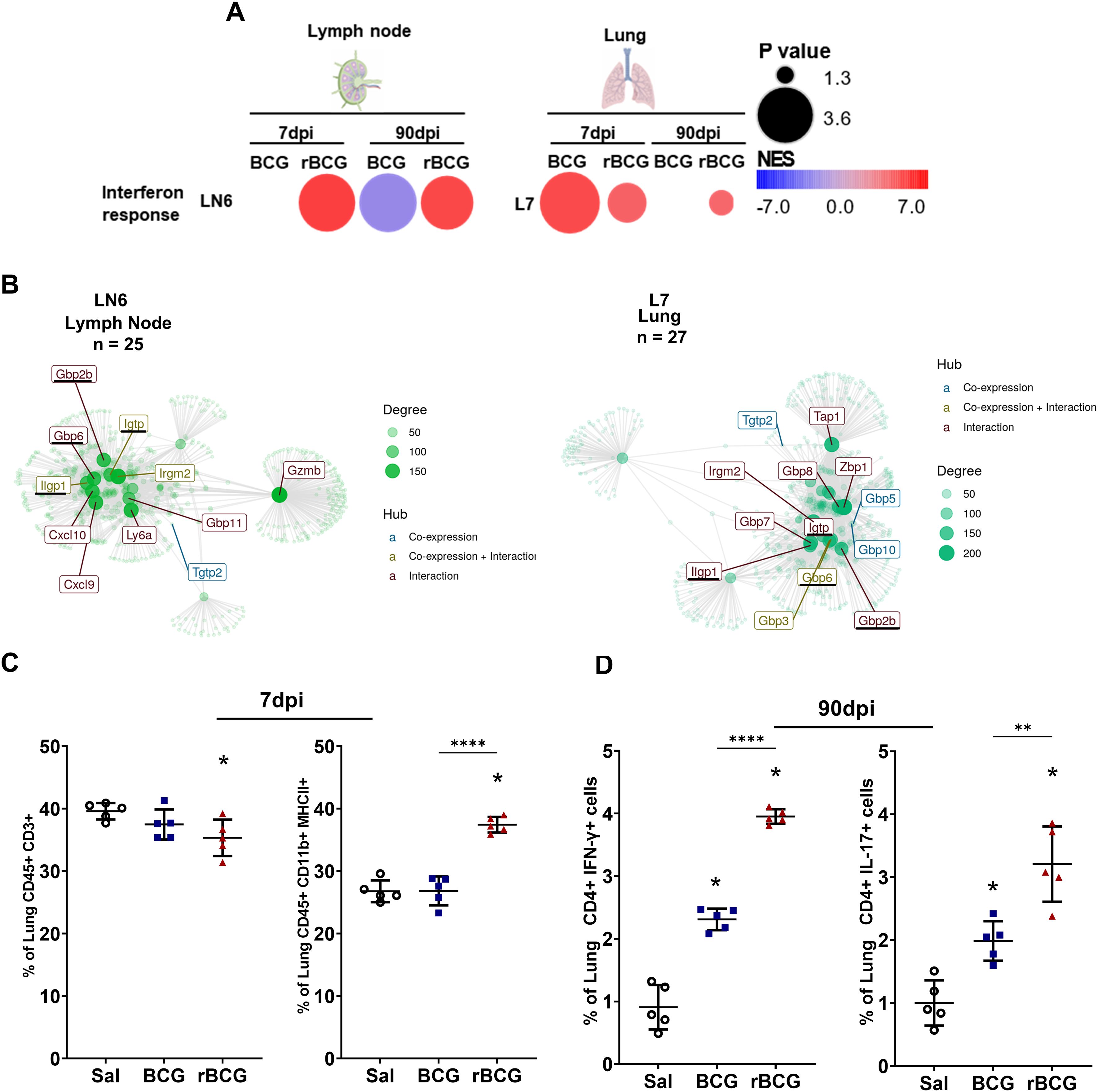 Figure 3. Co-expression analysis shows long-term regulation of IFN-γ-inducible genes by rBCG-LTAK63 immunization. (A) CEMiTool co-expression analysis was performed in BCG- and rBCG-LTAK63-immunized mice at 7- and 90-dpi. LN6: module 6 in lymph nodes; L7: module 7 in the lung. The color of the circles represents the Normalized Enrichment Score (NES), while the size indicates the -log10 P value. (B) The interaction maps show the connection between gene nodes in LN6 and L7, at 7 and 90-dpi, corresponding to the 25 and 27 genes of their respective modules, as well as additional genes linked by co-expression and/or interaction. Gene hubs’ origin are colored according to co-expression (colored blue), interaction (colored red) or both (colored green). The magnitude of the node is directly proportional to its degree of interactions. (C) At 7-dpi, the profile of immune cells in the lung was assessed to identify T cells (CD3+ CD45+) and bulk (CD45+ MHC-II+). (D) CD4+IFN-γ+ and CD4+ IL-17+ cells were assessed at 90-dpi in the lungs. Data shows mean values ± SD. An asterisk (*) above a group indicates a significant difference compared to the Inf (control) group (P < 0.05, one-way ANOVA); ** indicates P 0.01 and **** indicates P < 0.001. Asterisks with a horizontal bar denote a significant difference between groups.