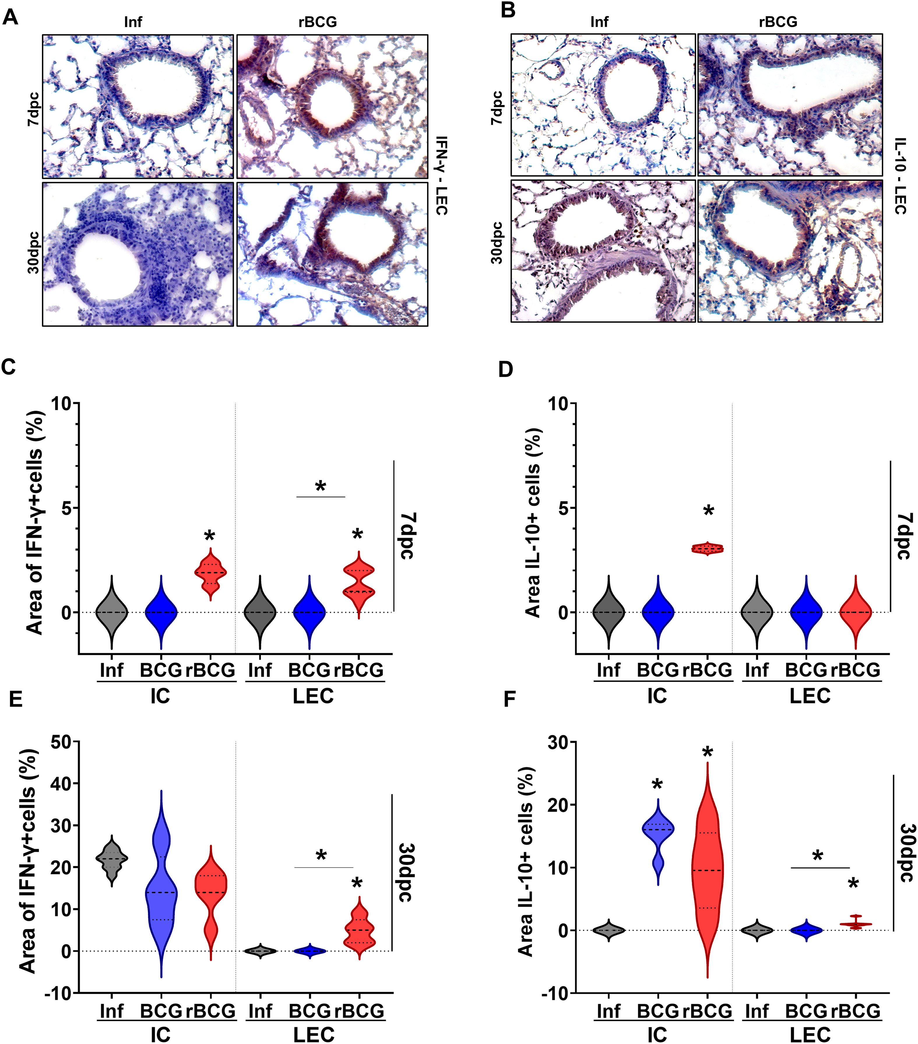 Figure 4. rBCG-LTAK63 induces increased IFN-γ+ cells in the infiltrating and epithelial cells in the lungs. Immunostaining of IFN-γ (A) and IL-10 (B) in lungs of immunized and control animals after Mtb challenge. The lung epithelial cells (LEC) (a,b) and infiltrated cells (IC) (Supplementary Figure 6A) were evaluated separately. The violin plots for IFN-γ (C, E) and IL-10 (D, F) display the percentage of positive area in comparison with total area of tissue (N=5), at 7 dpi and 30 dpi respectively. Data shows median values (dashed lines) and quartiles (dotted lines). An asterisk (*) above a group indicates a significant difference compared to the Inf (control) group (P < 0.05, one-way ANOVA). An asterisk with a horizontal bar denotes a significant difference between groups.