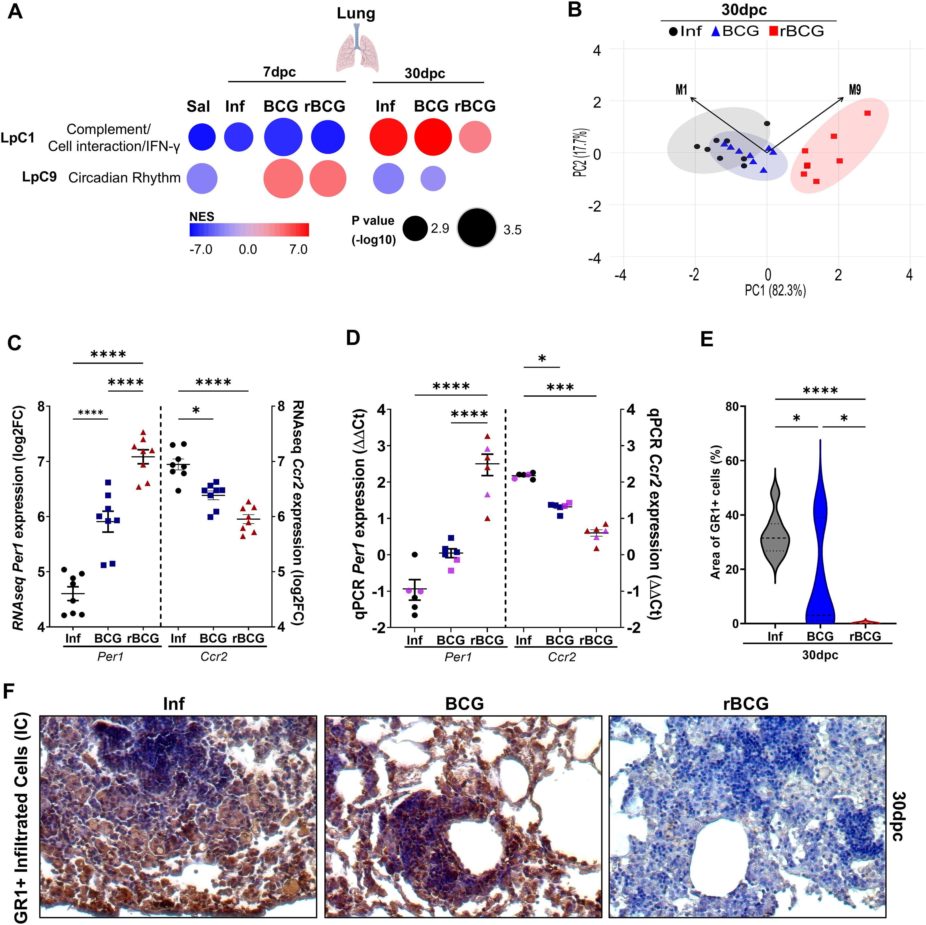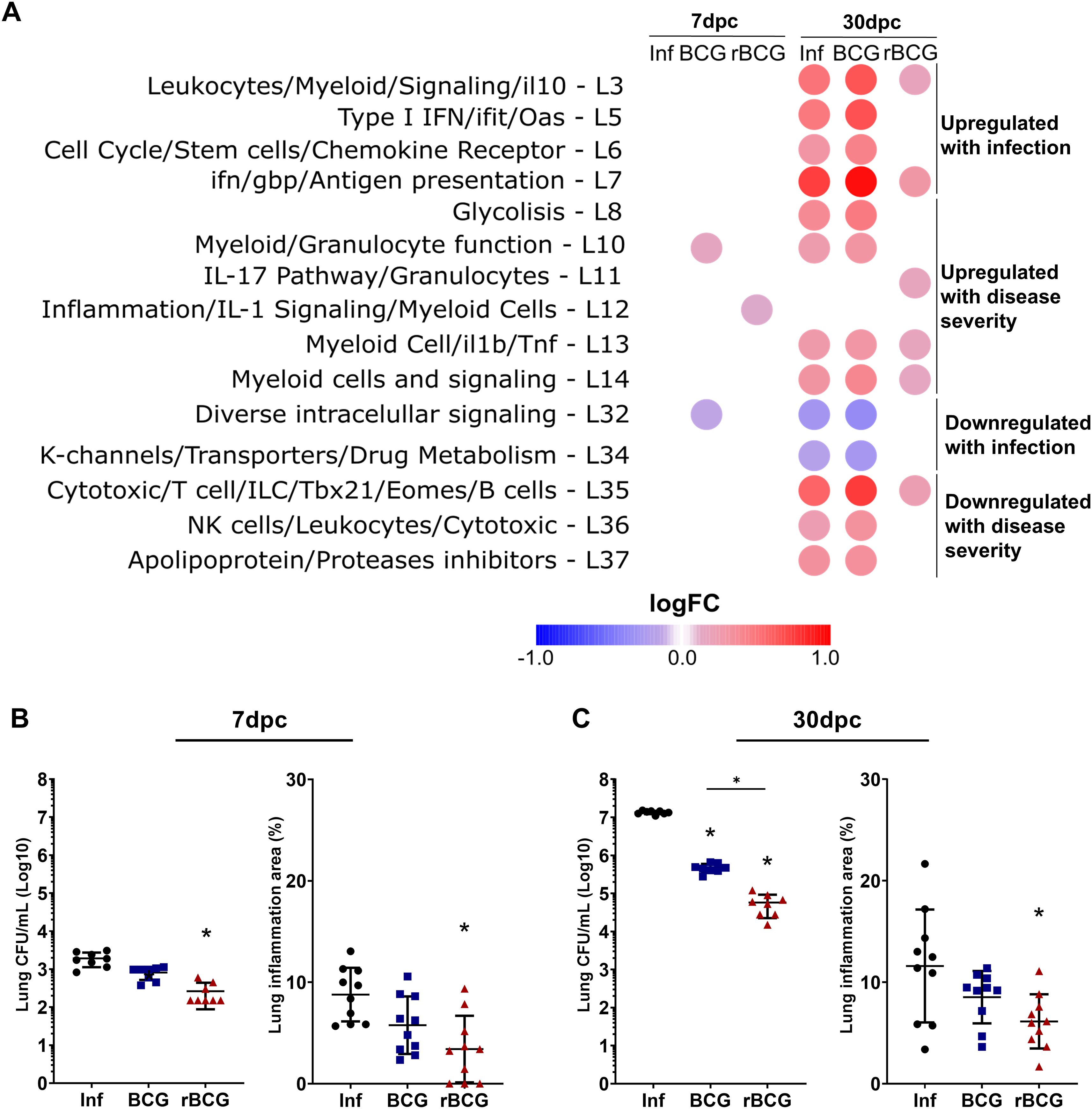 Molecular degree of perturbation (MDP) quantified how much each group deviated from the saline control. Scores at 30-dpc confirmed that the rBCG-LTAK63 group exhibited a substantial decrease in perturbation in comparison to the BCG or Inf groups (Supplementary Figure 1B). Similarly, Principal Component Analysis (PCA) showed that rBCG-LTAK63 group completely differentiates from the Inf and BCG groups at 30-dpc, which still significantly overlapped (Figure 1C). After immunization, at 7- and 90-, and early after challenge, at 7-dpc, there was an extensive overlap in the lung transcriptome patterns between the control and immunized groups (Supplementary Figure 1C).