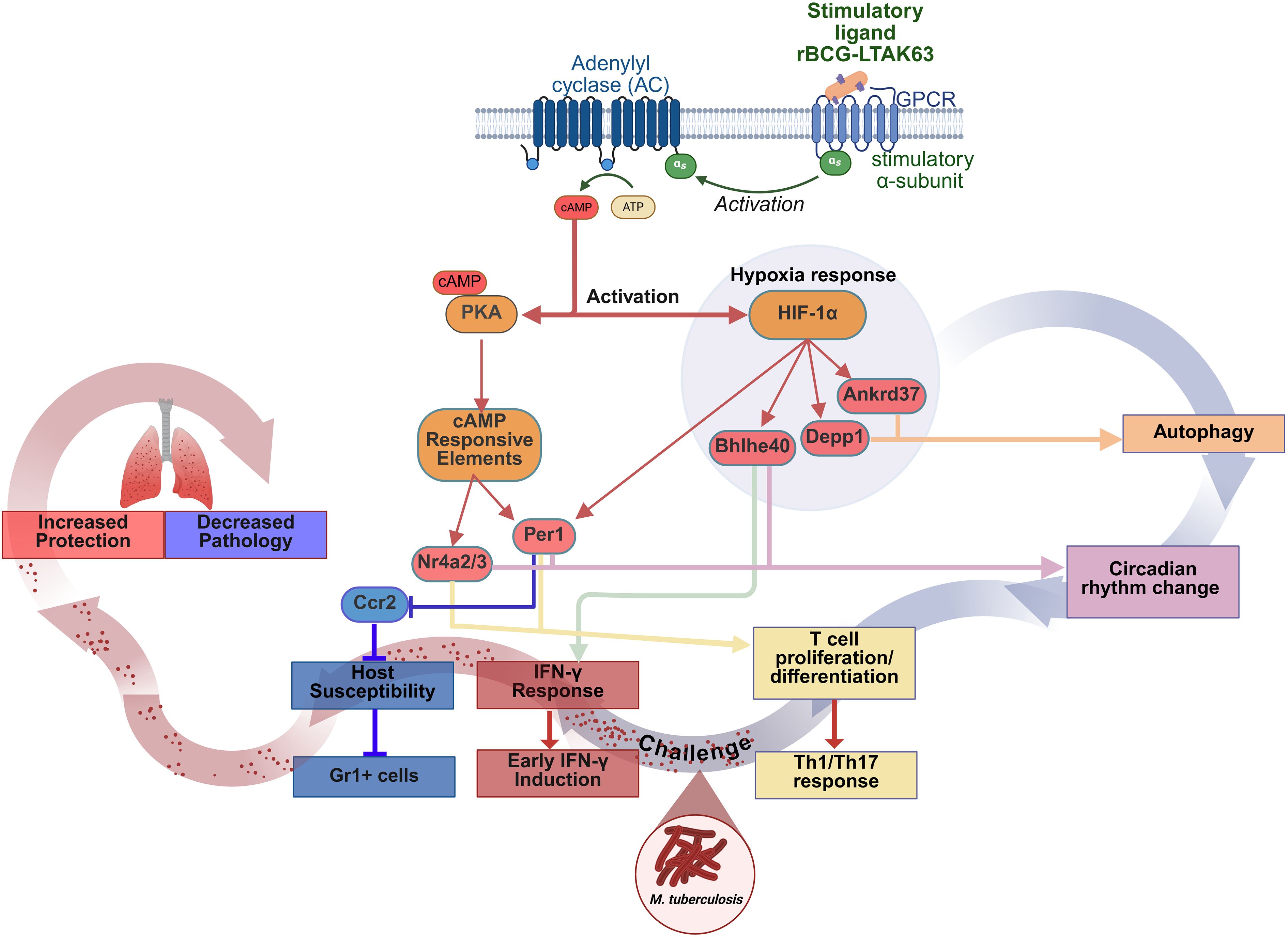 We used RNA sequencing (RNA-seq) focused on the lungs, the main site of tuberculosis disease, at various time points before and after Mtb exposure, to comprehensively study the impact of rBCG-LTAK63 vaccination in mice, to identify gene signatures aiming to understand how these alterations influence lung immune responses and contribute to protection against TB. The results highlight a potential role for cAMP induction, leading to activation of stress responses, autophagy and circadian rhythm pathways, accelerating IFN-γ responses and regulating inflammatory responses after challenge, which improve protection against tuberculosis.