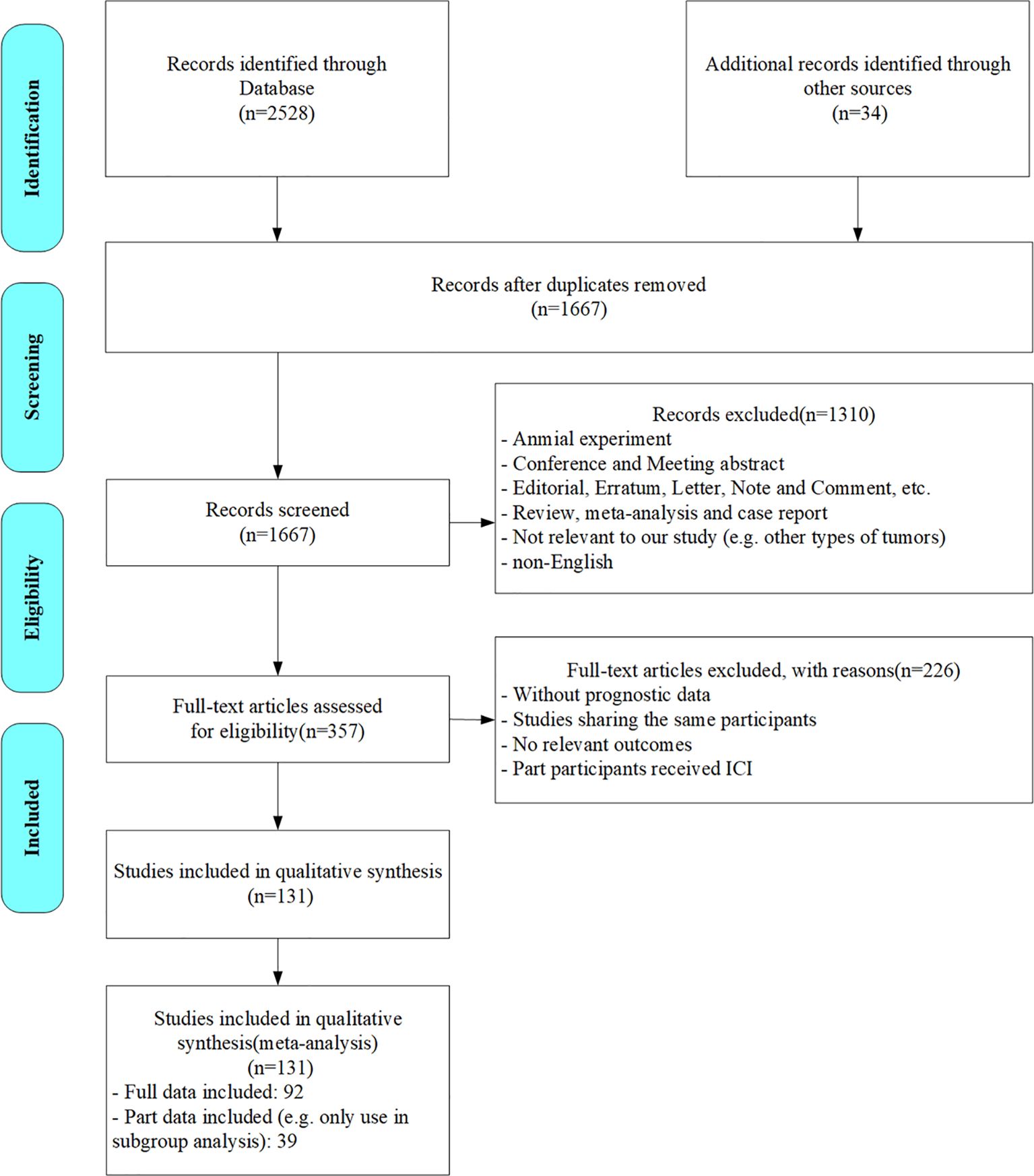 According to the search strategy, 2562 citations were initially identified. We screened out 895 duplicates and further perused the titles and abstracts of the rest. After the preliminary exclusion of the citations with the inclusion criteria, 357 citations were left for further full-text review. Upon meticulous assessment, 226 studies were excluded for the following reasons: lacking specific data (e.g. prognostic data, AFP levels/AFP response data or HR/OR data), cohorts fully or partially overlapped with other studies (unless the study provided data under different subgroups or on different prognostic indicators), outcomes unrelated to the research focus, or only part of the participants received ICIs therapy. Ultimately, 131 studies were included in our analyses. The flowchart of the literature search process is presented in Figure 1.