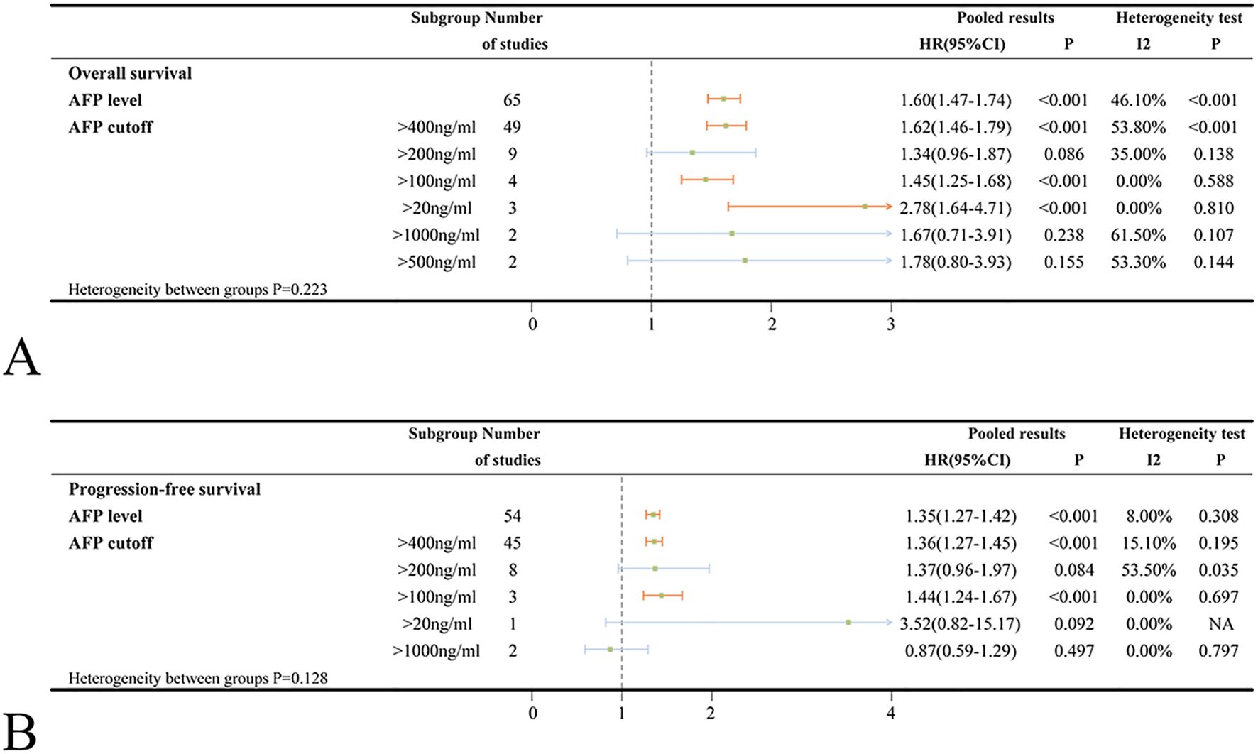 Graphical abstract of meta-analysis results presented in two parts.   A) Overall survival data is listed by alpha-fetoprotein (AFP) cutoff levels ranging from greater than twenty nanograms per milliliter to greater than one thousand nanograms per milliliter. Hazard ratios and heterogeneity statistics indicate significant results mostly for higher AFP levels.  B) Progression-free survival data also categorized by AFP cutoffs. Similar patterns of hazard ratios are displayed, generally showing reduced significance compared to overall survival.  Both sections include forest plots with pooled results and heterogeneity tests.