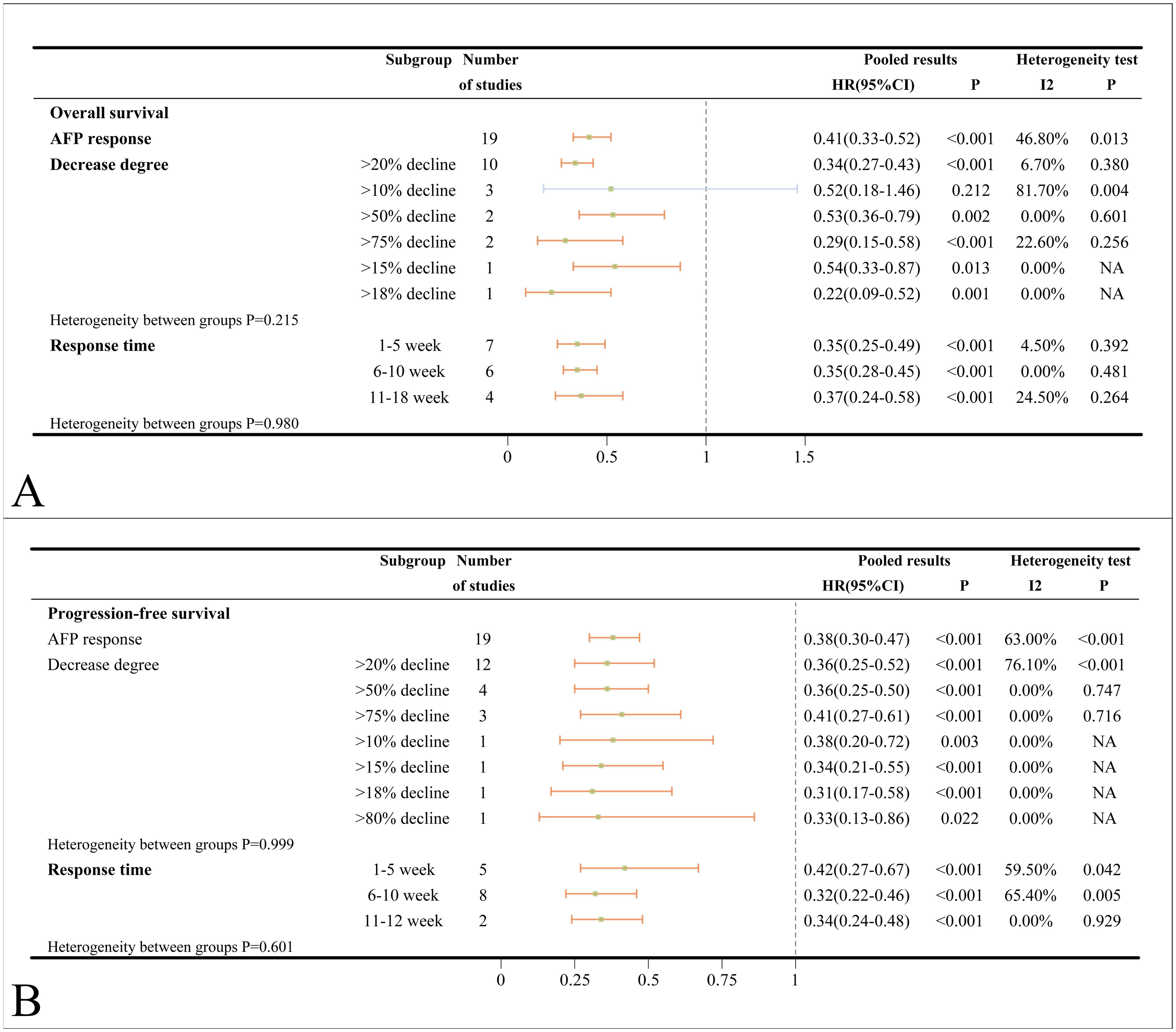 Forest plots showing two different analyses. Panel A illustrates overall survival with subgroups based on AFP response, decrease degree, and response time, along with heterogeneity tests. Panel B depicts progression-free survival with similar subgroup categorizations and heterogeneity results. Hazard ratios with confidence intervals and heterogeneity statistics are included for each subgroup.