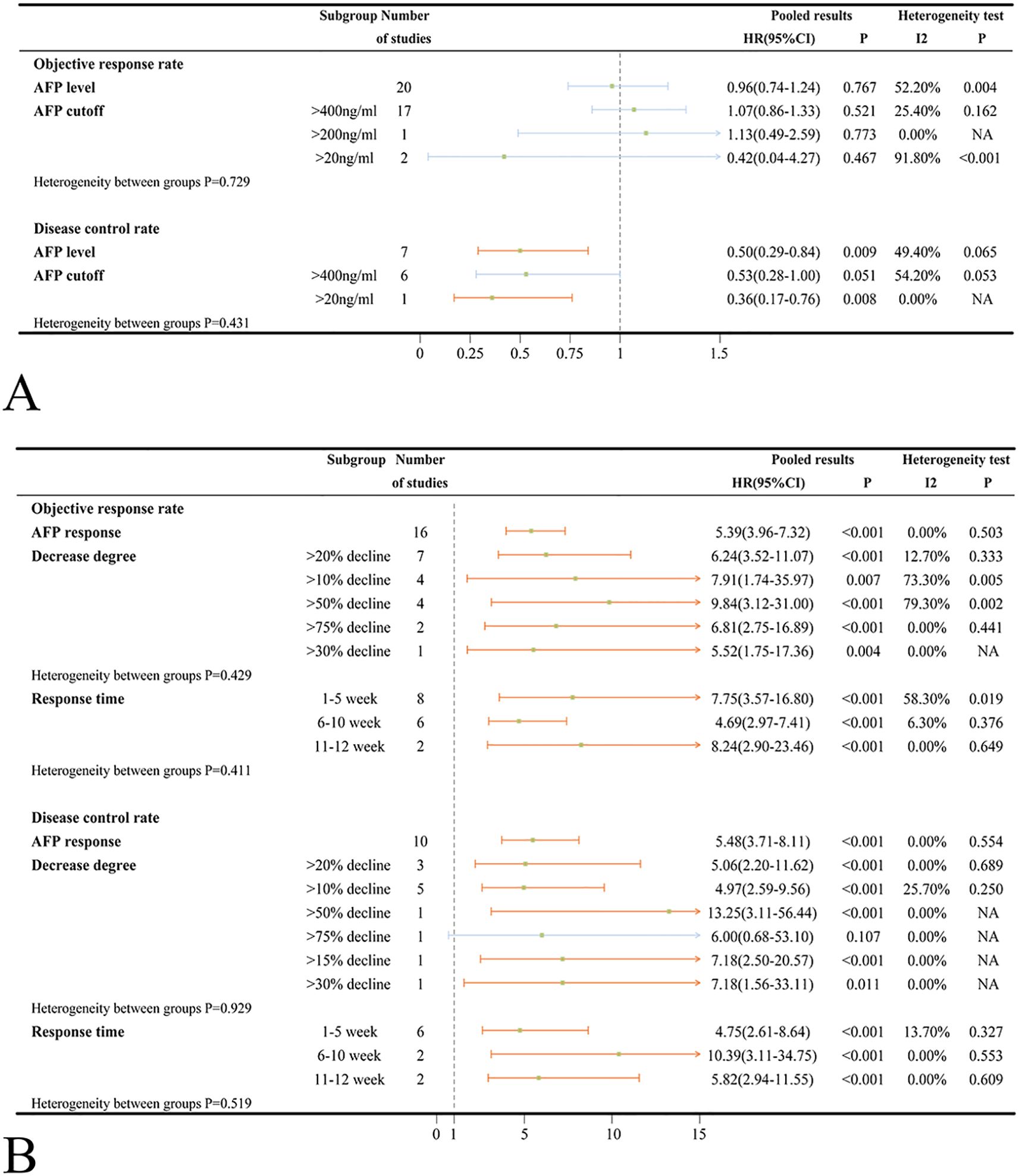 Two forest plots displaying meta-analysis results. Plot A: Shows objective response rate and disease control rate by AFP level subgroups. Objective response details include pooled results with significant variability. Disease control shows less variability with distinct HR values. Plot B: Displays objective response rate and disease control rate by AFP response decrease degree and response time subgroups. Response degrees, such as >20% and >50% decline, show varying HR values with significant heterogeneity. Each plot includes heterogeneity tests with noted p-values and I² statistics.