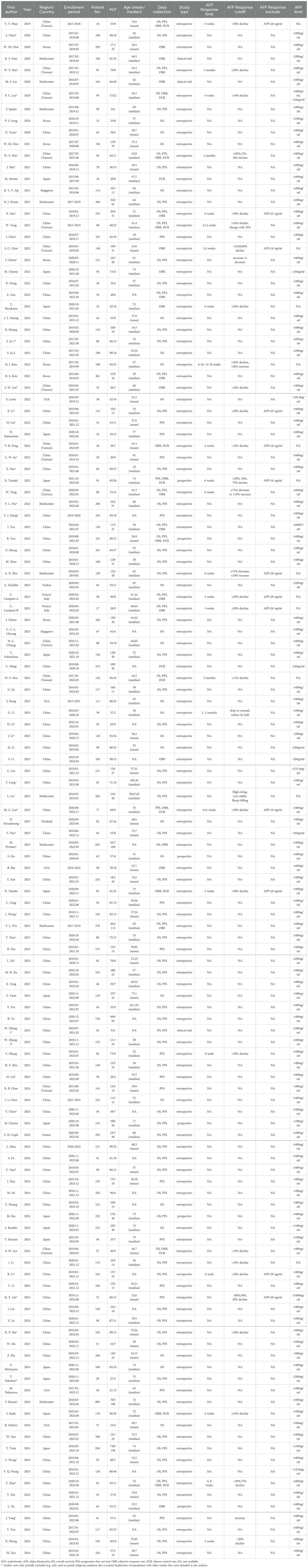 38. Tian BW, Yan LJ, Ding ZN, Liu H, Meng GX, Xue JS, et al. Early alpha-fetoprotein response predicts prognosis of immune checkpoint inhibitor and targeted therapy for hepatocellular carcinoma: a systematic review with meta-analysis. Expert Rev Gastroenterol Hepatol. (2023) 17:73–83. doi: 10.1080/17474124.2022.2156859