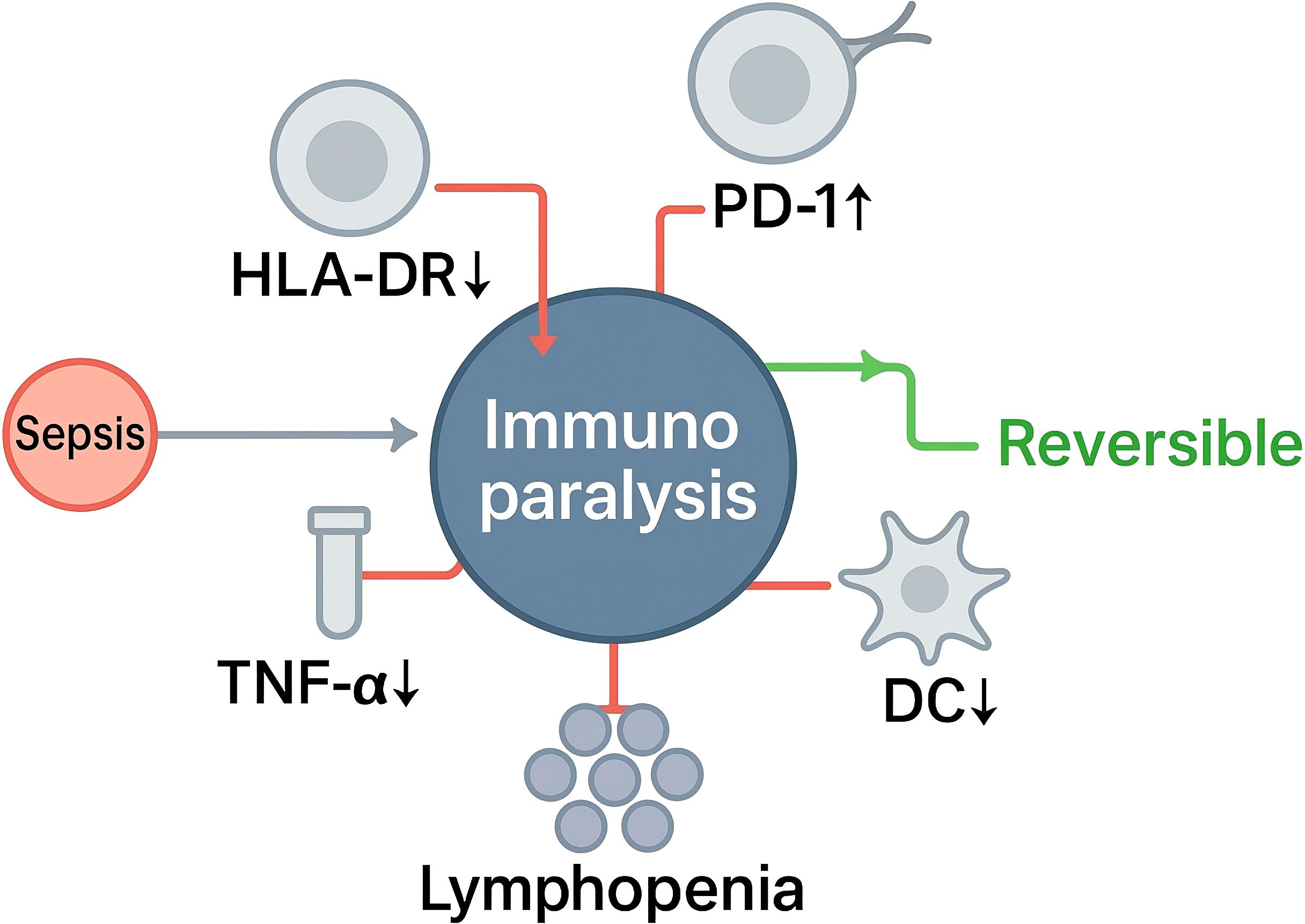 A practical definition of immunoparalysis in sepsis is a time-varying syndrome of impaired innate and adaptive immunity evidenced by persistently low monocyte HLA-DR, reduced stimulus-induced cytokine production capacity, lymphocyte depletion and/or exhaustion signatures, and dendritic-cell deficiency, each associated with elevated risk of secondary infection and mortality. This framework supports standardized endotyping and provides an entry point for biomarker-guided, immune-restorative strategies in critical illness. Secondary infection’ denotes a new, adjudicated infection ≥48 h after index presentation (or after initial control), assessed in day-14 and day-28 windows.