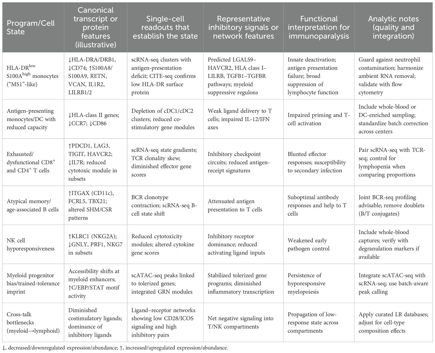 Single-cell modalities resolve the composite nature of immune low-response states by jointly defining cell identities, activation gradients, and regulatory dependencies at single-cell resolution. Across independent cohorts, scRNA-seq consistently identifies an expanded myeloid program characterized by HLA-DR suppression and increased S100A8/A9, RETN, VCAN, and IL1R2 expression—often referred to as the “MS1/HLA-DRlow S100Ahigh” monocyte state—which is mechanistically linked to impaired antigen presentation and broad inhibitory crosstalk with lymphocytes and dendritic cells (e.g., predicted LGALS9–HAVCR2 and class I HLA–LILRB interactions) (44–46). These features recapitulate clinically recognized innate deactivation and provide a cell-state framework for immunoparalysis endotyping, as detailed in Table 1.