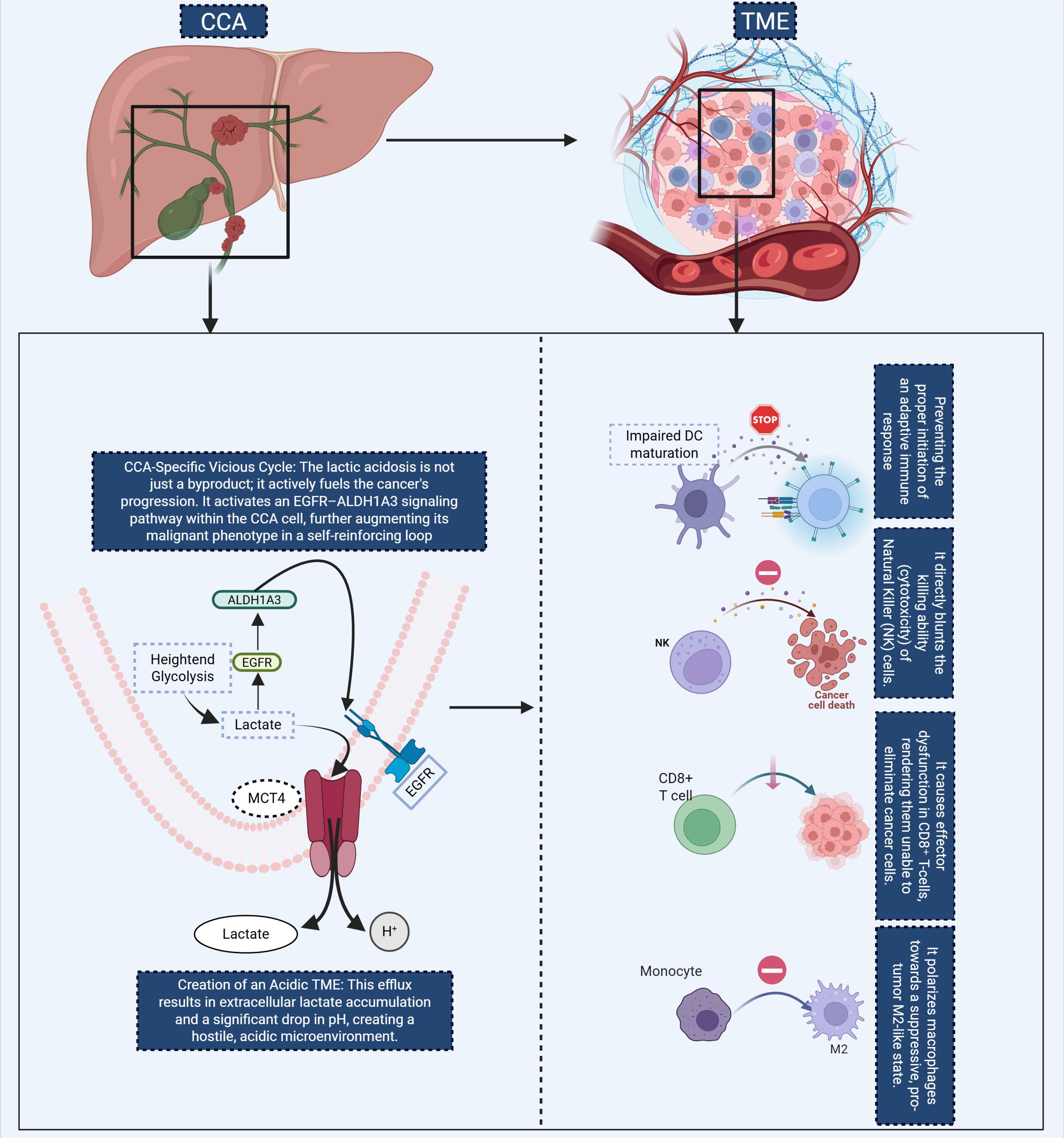 Figure 2. This diagram illustrates the self-reinforcing metabolic cycle in CCA and its effects on the TME. In CCA cells, lactate accumulation from heightened glycolysis activates the EGFR-ALDH1A3 signaling pathway, further promoting glycolysis and contributing to the malignant phenotype. This results in lactate efflux via MCT4, creating an acidic TME that impairs immune function. The figure highlights key immune alterations in the TME, including impaired DC maturation, which inhibits the activation of adaptive immune responses, and direct suppression of NK cell cytotoxicity, reducing antitumor immunity. Additionally, CD8+ T cell function is impaired, and monocytes are skewed toward an immunosuppressive M2 macrophage phenotype, further exacerbating immune evasion. These metabolic and immune alterations promote cancer progression by both directly fueling tumor growth and preventing effective immune surveillance. CCA, Cholangiocarcinoma; TME, tumor microenvironment; DC, Dendritic Cell; NK, Natural Killer.