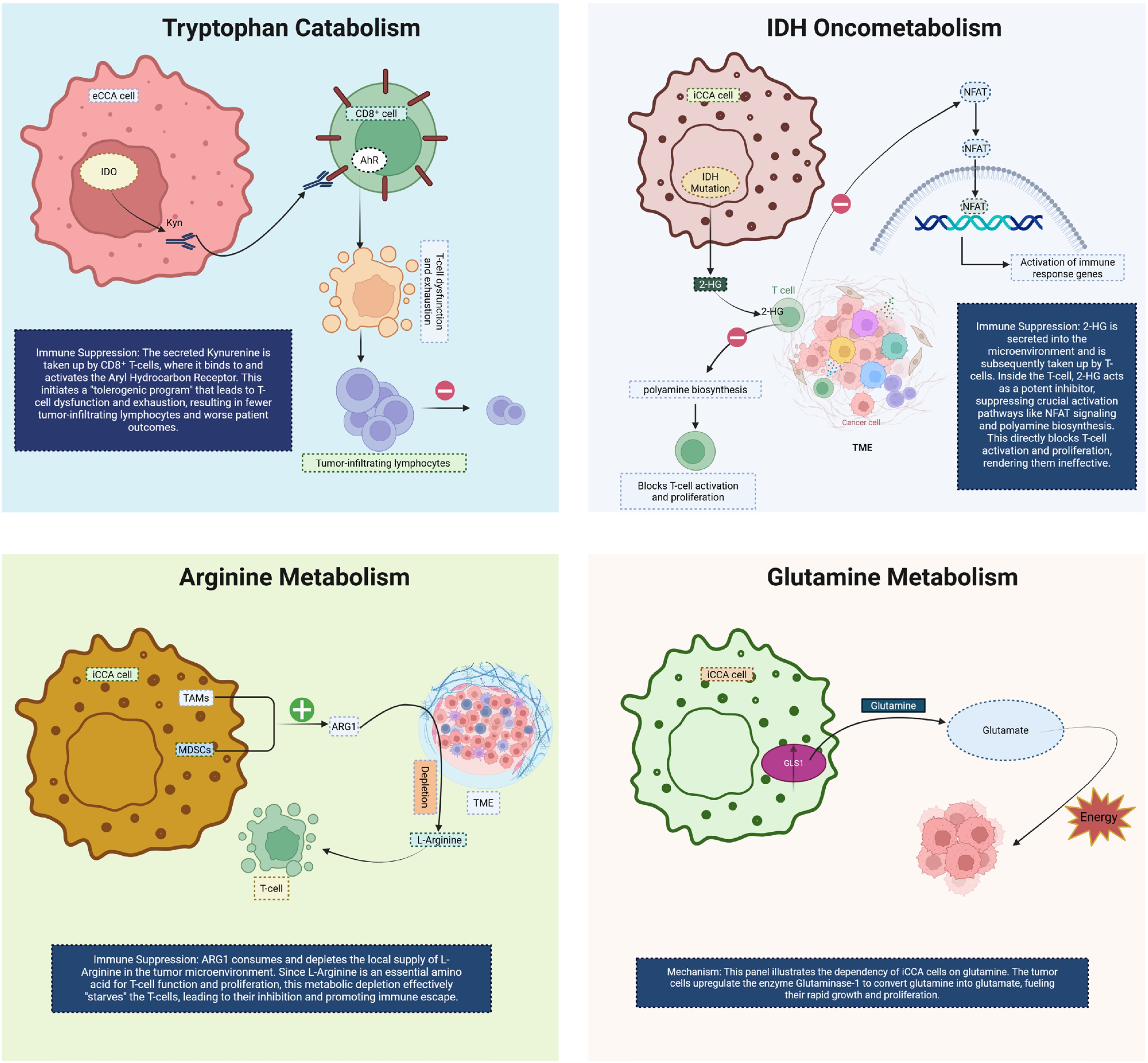 Figure 3. This diagram illustrates key metabolic pathways in CCA and their role in immune suppression and tumor progression. In the top-left panel, tryptophan catabolism via IDO leads to the production of kynurenine, which is taken up by CD8+ T cells. Binding of kynurenine to the AhR induces T cell exhaustion and dysfunction, resulting in fewer tumor-infiltrating lymphocytes and poorer patient outcomes. The top-right panel highlights IDH oncometabolism, where IDH mutations in CCA cells produce 2HG, which inhibits T cell activation by altering NFAT signaling, polyamine biosynthesis, and T cell proliferation, thus impairing immune responses. In the bottom-left panel, arginine metabolism is altered by TAMs and mesenchymal stem cells, which upregulate ARG1 expression. This leads to local depletion of L-arginine, impairing T cell activation and proliferation, thereby promoting immune evasion. Finally, the bottom-right panel shows glutamine metabolism in CCA cells. Tumor cells upregulate the enzyme glutaminase, converting glutamine to glutamate, which provides energy for rapid growth and proliferation. Together, these metabolic changes facilitate immune escape and tumor progression in CCA. CCA, Cholangiocarcinoma; eCCA, extrahepatic Cholangiocarcinoma; iCCA, Intrahepatic cholangiocarcinoma; IDO, Indoleamine 2,3-dioxygenase; AhR, Hydrocarbon receptor; 2-HG, R-2-hydroxyglutarate; TME, tumor microenvironment; TAMs, Tumor-associated macrophages; MDSCs, Myeloid-derived suppressor cells; ARG1, Arginase-1; GLS1, Glutaminase-1.