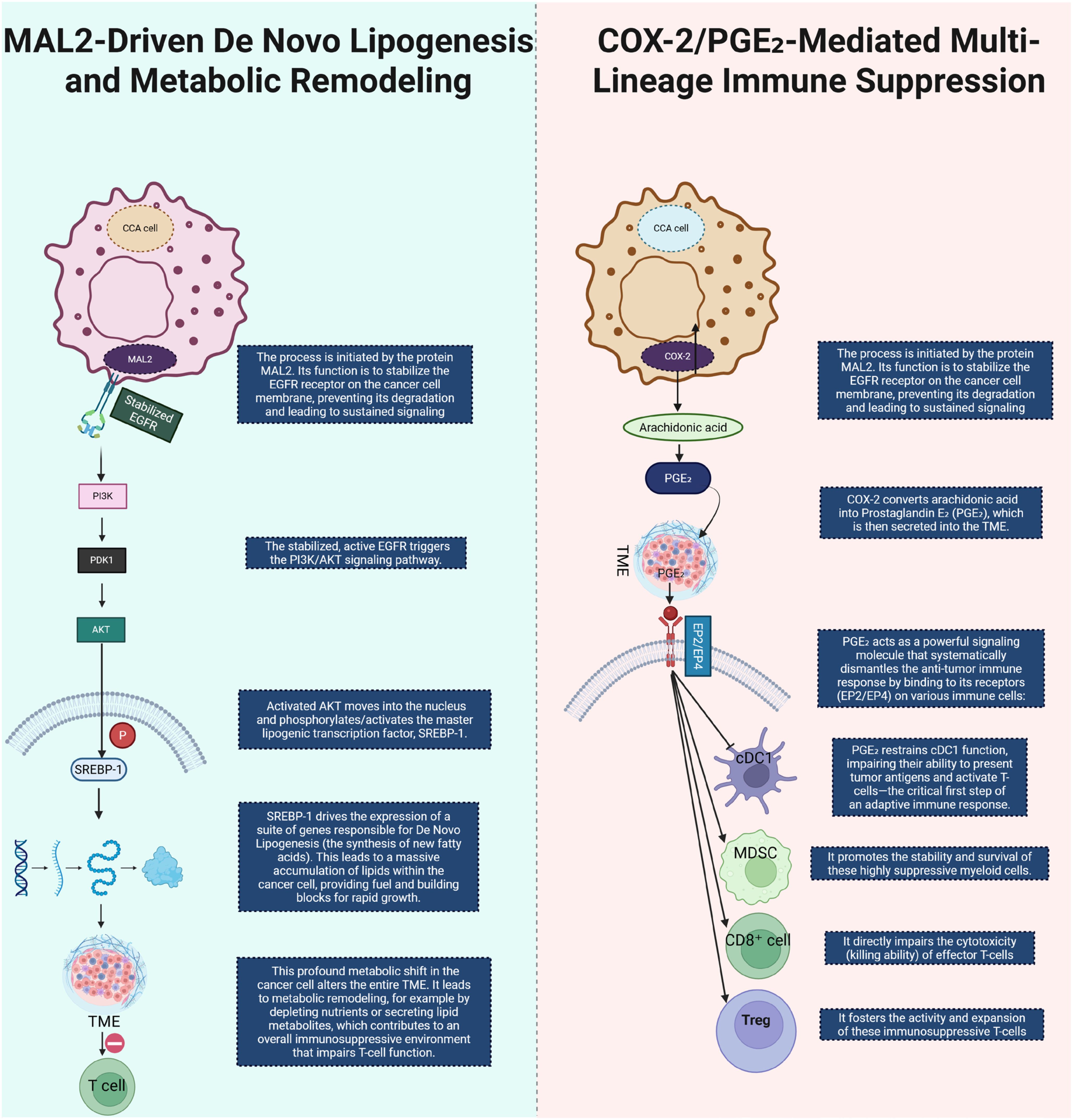 Figure 4. This diagram illustrates two key metabolic and immune-modulatory processes in CCA. On the left, MAL2-driven de novo lipogenesis is shown to initiate by stabilizing EGFR on the cancer cell membrane. This stabilization prevents EGFR degradation and leads to sustained EGFR signaling, triggering the PI3K/AKT signaling pathway. Activated AKT translocates to the nucleus, where it activates the lipogenic transcription factor SREBP-1. SREBP-1 induces the expression of genes responsible for lipid synthesis, promoting lipid accumulation within CCA cells, thus fueling tumor growth and contributing to an immune-suppressive TME that impairs T cell function. On the right, COX-2/PGE2-mediated immune suppression is depicted. COX-2 converts arachidonic acid into PGE2, which is secreted into the TME. PGE2 suppresses the immune response by binding to its receptors (EP2/EP4) on various immune cells. It inhibits the function of dendritic cells (DCs), promoting immune evasion, while enhancing the stability and expansion of MDSCs and Tregs, and impairing the cytotoxicity of CD8+ T cells. This multi-lineage immune suppression facilitates tumor immune evasion and progression in CCA. CCA, Cholangiocarcinoma; COX2, Cyclooxygenase-2; PGE2, Prostaglandin E2; TME, tumor microenvironment; Cdc1, Conventional Dendritic Cell, MDSC, Myeloid-Derived Suppressor Cell; Treg, Regulatory T-cell.