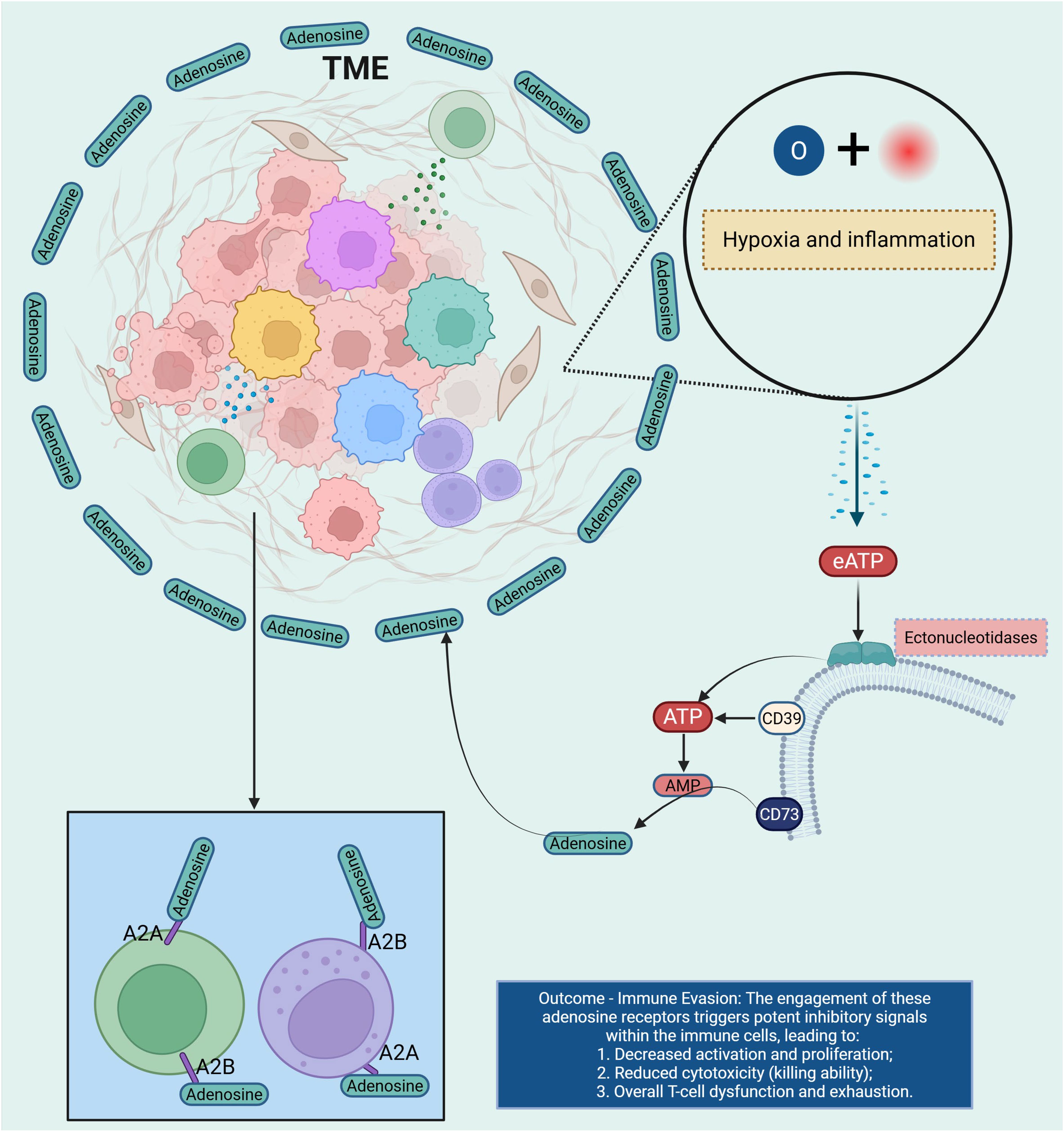 Figure 5. This diagram illustrates the role of adenosine receptors in immune suppression within the TME. Under conditions of hypoxia and inflammation, eATP is released into the TME. Ectonucleotidases, including CD39 and CD73, hydrolyze eATP into adenosine, which binds to adenosine receptors (A2A and A2B) on immune cells. The engagement of these receptors triggers potent inhibitory signals, leading to decreased activation and proliferation of immune cells, reduced cytotoxicity, and overall T cell dysfunction and exhaustion. This results in immune evasion, as adenosine signaling dampens the immune response, allowing the tumor to escape immune surveillance and progress. TME, tumor microenvironment; Extracellular ATP; AMP, Adenosine Monophosphate.