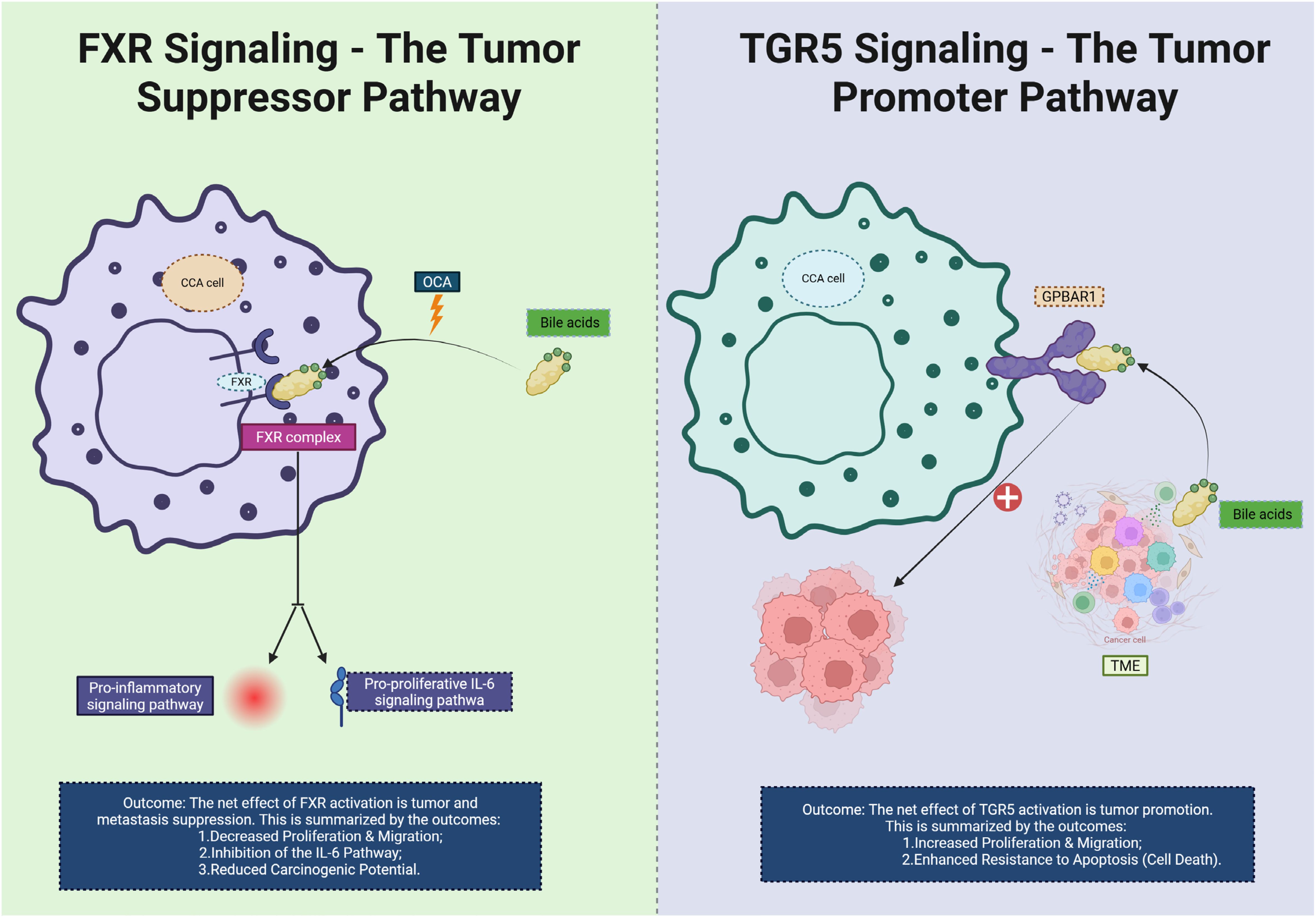 Figure 6. This diagram illustrates the contrasting roles of FXR and TGR5 signaling pathways in CCA. On the left, FXR signaling is shown as a tumor suppressor pathway. Bile acids activate FXR, which binds to the FXR complex in the CCA cell. This activation inhibits pro-inflammatory signaling and reduces the pro-proliferative IL-6 pathway, leading to decreased cell proliferation, migration, and a reduced carcinogenic potential. The net effect of FXR activation is the suppression of tumor progression and metastasis. On the right, TGR5 signaling acts as a tumor promoter. Bile acids activate TGR5 and upregulate the GPBAR1 receptor on the CCA cell, which stimulates increased cell proliferation, migration, and enhanced resistance to apoptosis (cell death). The overall effect of TGR5 activation is the promotion of tumor growth and immune evasion within the TME. CCA, Cholangiocarcinoma; TME, tumor microenvironment; OCA, Obeticholic Acid; FXR, Farnesoid X Receptor.