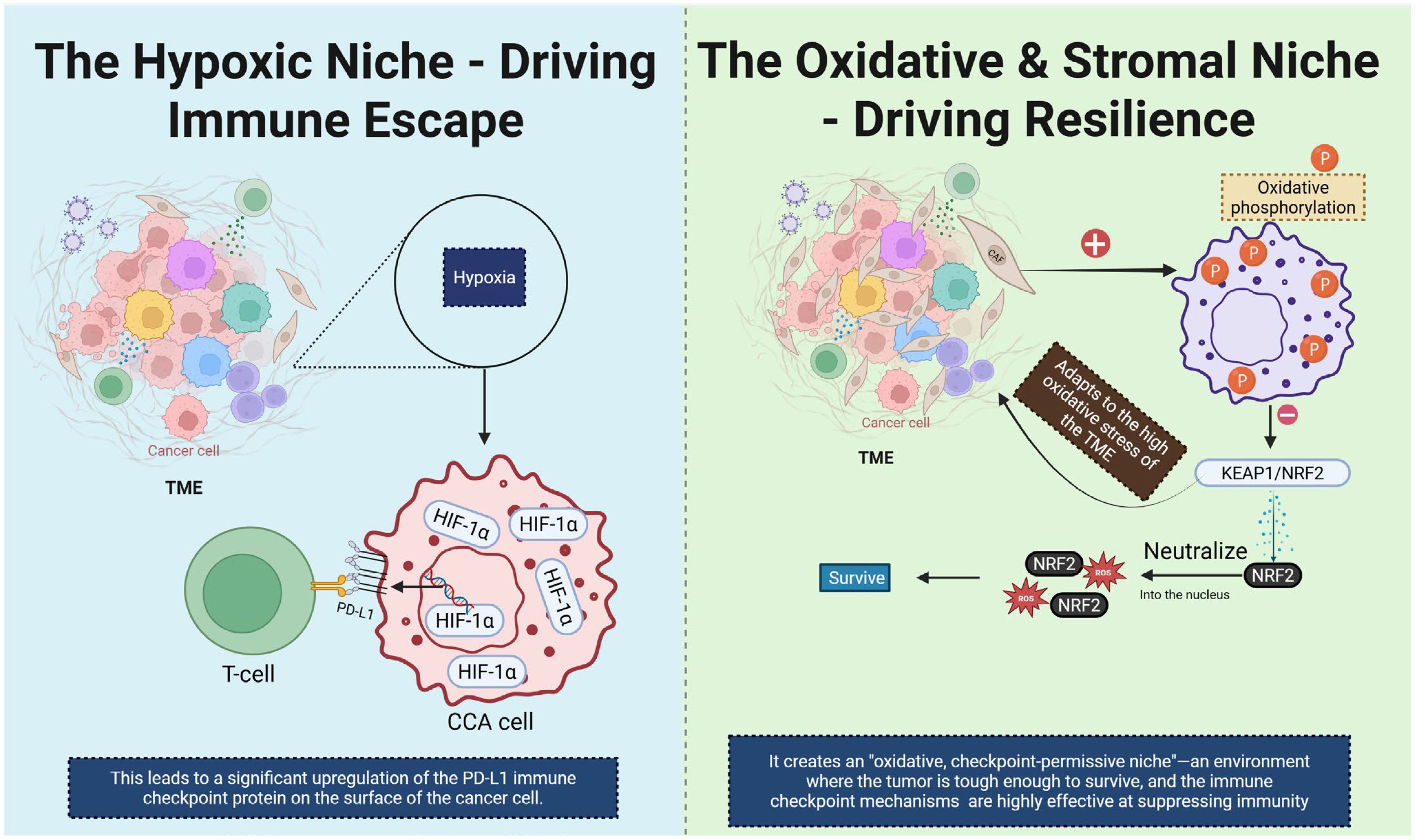 Figure 7. This diagram illustrates two distinct TME niches that contribute to immune escape and resilience in CCA. On the left, the hypoxic niche is depicted. Hypoxia in the TME leads to stabilization and activation of HIF-1α, which upregulates the expression of PD-L1 on CCA cells. This results in immune evasion by inhibiting T cell activation, as PD-L1 interacts with the PD-1 receptor on T cells. On the right, the oxidative and stromal niche is shown. High oxidative stress in the TME induces oxidative phosphorylation, activating the KEAP1/NRF2 signaling pathway. NRF2 translocates into the nucleus and promotes the expression of antioxidant genes, helping the tumor cells survive in the harsh oxidative environment. This creates an “oxidative, checkpoint-permissive niche” where the tumor becomes resilient to immune attacks and immune checkpoint mechanisms effectively suppress immune responses. CCA, Cholangiocarcinoma; TME, tumor microenvironment; CAF, Cancer-Associated fibroblast.