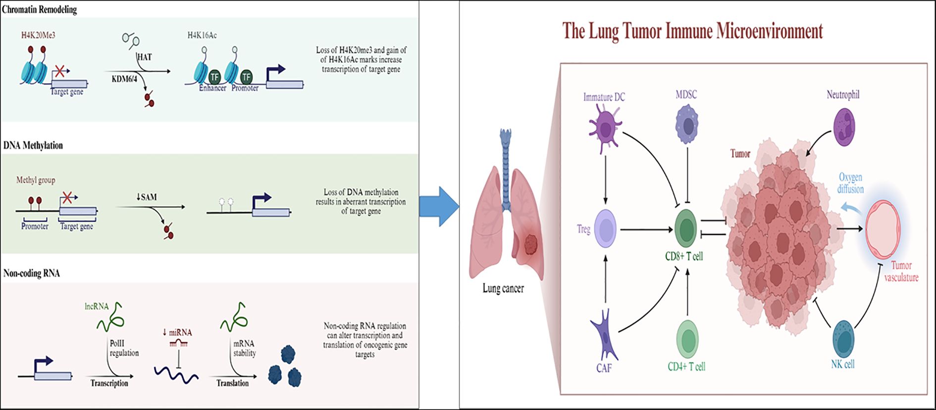 Figure 1. The relationship between epigenetic regulation (DNA methylation, histone modification, non-coding RNA regulation) and the microenvironment of lung cancer. (Left panel) Major epigenetic mechanisms—including chromatin remodeling, DNA methylation, and non-coding RNA regulation—contribute to aberrant gene expression in lung cancer. In chromatin remodeling, loss of the repressive mark H4K20me3 and gain of the active mark H4K16Ac through KDM6/4 and HAT activity enhance chromatin accessibility and transcription of oncogenic target genes. In DNA methylation, reduced S-adenosylmethionine (SAM) levels and DNA hypomethylation lead to abnormal activation of tumor-promoting genes. In non-coding RNA regulation, lncRNAs and miRNAs modulate gene expression by influencing Pol II–mediated transcription, mRNA stability, and translation of oncogenic transcripts.(Right panel) These epigenetic alterations collectively reshape the lung tumor immune microenvironment (TIME). Aberrant gene regulation affects key immune populations, including immature dendritic cells (DCs), myeloid-derived suppressor cells (MDSCs), regulatory T cells (Tregs), cancer-associated fibroblasts (CAFs), CD4+/CD8+ T cells, NK cells, and neutrophils. Epigenetic reprogramming in tumor and stromal cells impairs antigen presentation, promotes immunosuppression, and alters oxygen diffusion and vascular remodeling, ultimately leading to immune escape and tumor progression.(activating (→) and inhibitory (⟞)).