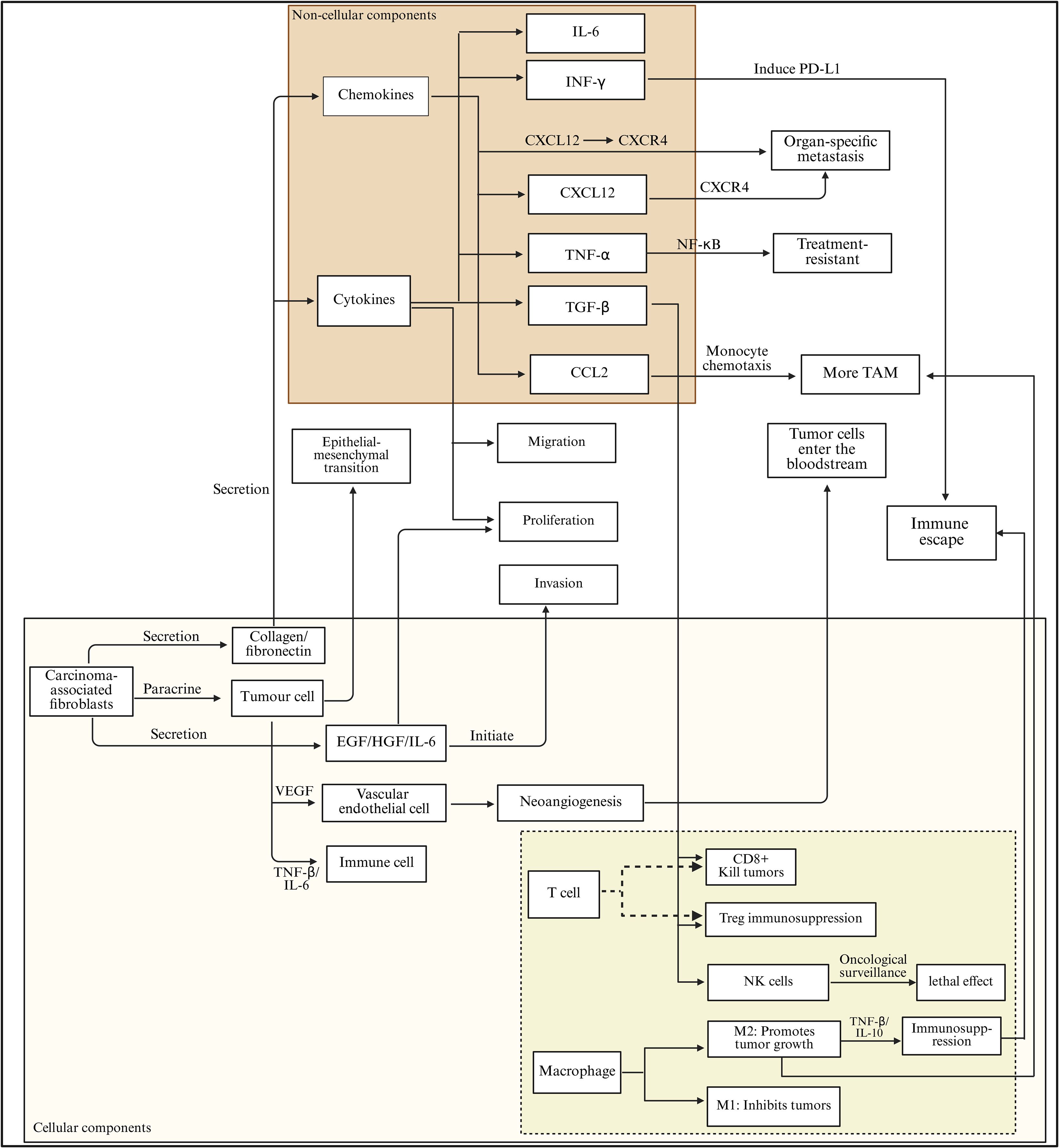 Figure 2. Cytokine–chemokine network and cellular crosstalk driving immune escape in the lung tumor microenvironment. Cytokines and chemokines within the lung tumor microenvironment orchestrate a complex signaling network that promotes tumor progression and immune evasion. Key mediators such as IL-6, IFN-γ, CXCL12, TNF-α, TGF-β, and CCL2 regulate epithelial–mesenchymal transition (EMT), proliferation, migration, invasion, and neoangiogenesis. Through activation of CXCL12/CXCR4 and NF-κB signaling, these factors induce PD-L1 expression, enhance monocyte chemotaxis, and drive the recruitment of tumor-associated macrophages (TAMs), contributing to metastasis and treatment resistance. In parallel, carcinoma-associated fibroblasts secrete EGF, HGF, and IL-6, which stimulate tumor and endothelial cells to initiate vascular remodeling and immune suppression. Within the immune compartment, CD8+ T cells and NK cells mediate cytotoxic responses, while Tregs and M2 macrophages promote immunosuppression via TNF-β and IL-10 secretion, collectively enabling immune escape and tumor dissemination.