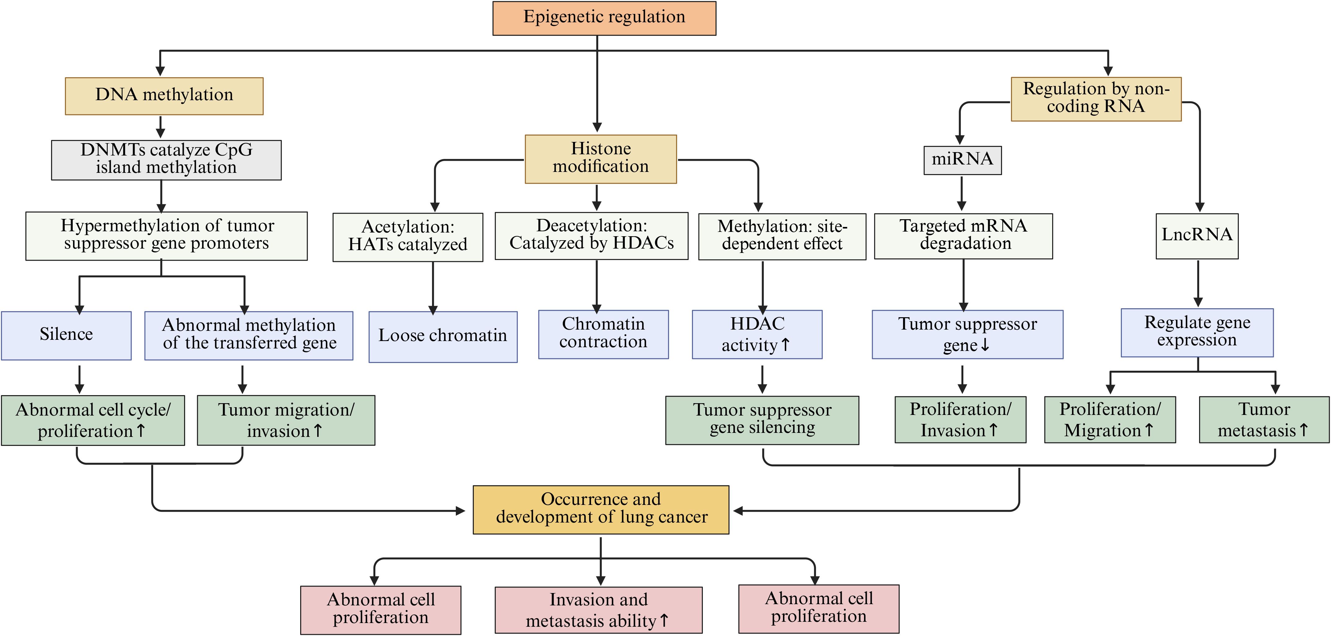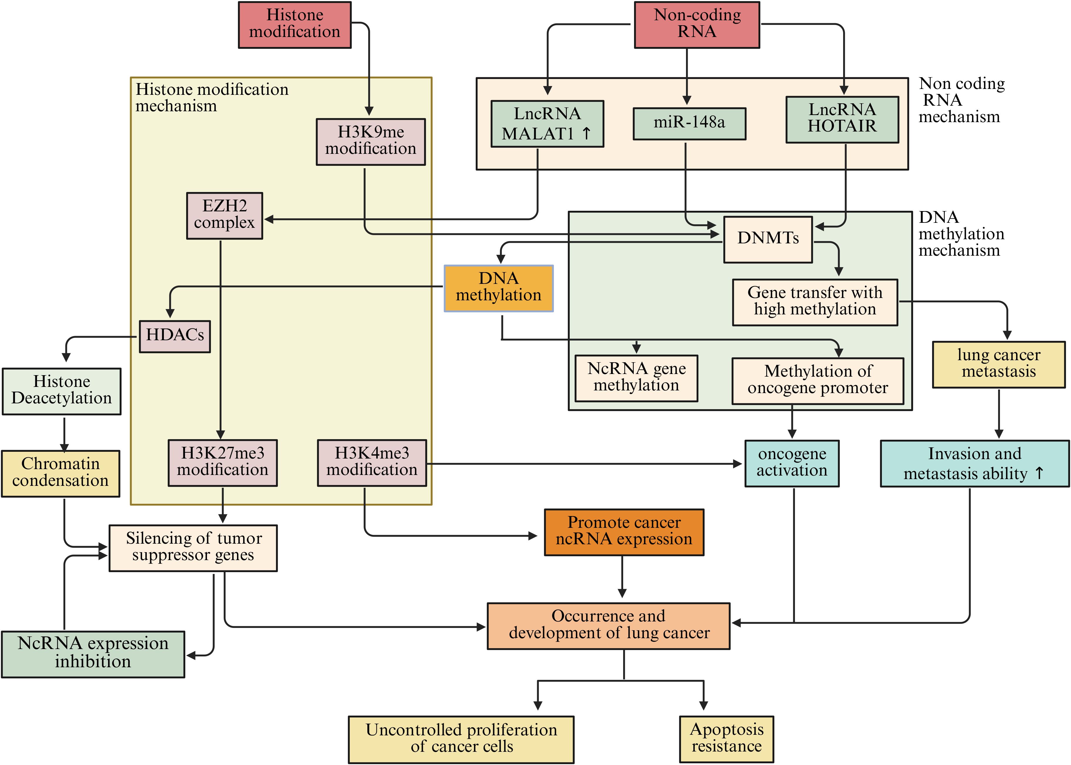 Figure 8. The interaction among DNA methylation, histone modification, and ncRNAs in the microenvironment of lung cancer jointly affects the biological behavior of lung cancer cells.