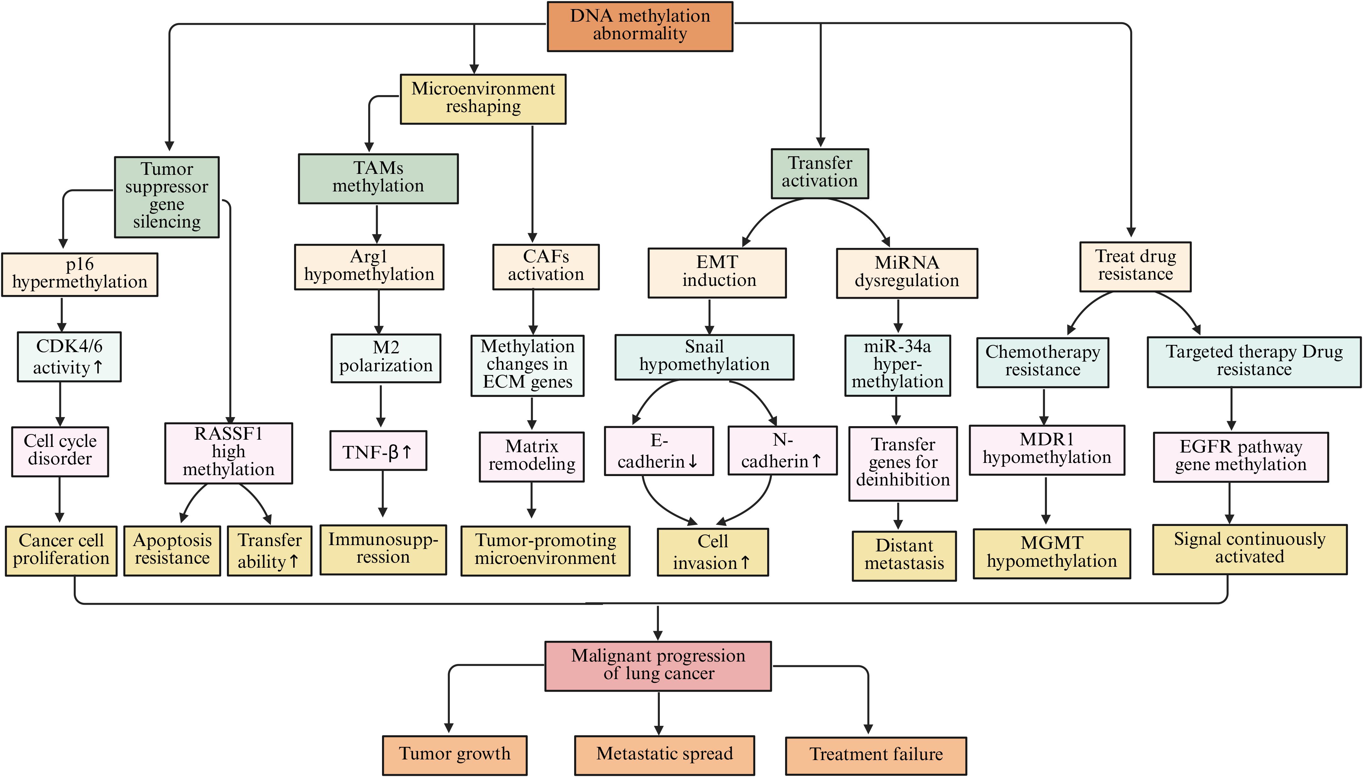 During the metastasis of lung cancer, DNA methylation also plays an important role. EMT is a key process for tumor cells to acquire invasive and metastatic capabilities (156). Studies have shown that DNA methylation can influence the metastatic ability of lung cancer cells by regulating the expression levels of EMT-related genes (157). Transcription factors such as Snail and Slug are key regulatory factors in the EMT process. During the metastasis of lung cancer cells, the methylation status of the promoter regions of their genes undergoes hypomethylation, which leads to the upregulation of these transcription factors (158). Low methylation of the Snail gene promoter increases its expression. The Snail protein can bind to the promoter region of the E-cadherin gene and inhibit its expression, which decreases cell-cell adhesion among lung cancer cells. Additionally, Snail promotes the expression of mesenchymal markers such as N-cadherin and vimentin. This allows lung cancer cells to acquire mesenchymal characteristics, making them more prone to invasion and metastasis (159). Furthermore, studies have found that the methylation state of certain miRNA genes related to tumor metastasis is closely associated with lung cancer metastasis (160). The miR-34a gene is often downregulated in lung cancer due to high methylation of its promoter. miR-34a targets and inhibits several genes associated with tumor metastasis. Following miR-34a downregulation, its inhibitory effect on target genes weakens, leading to enhanced invasion and metastatic ability of lung cancer cells (161–163).