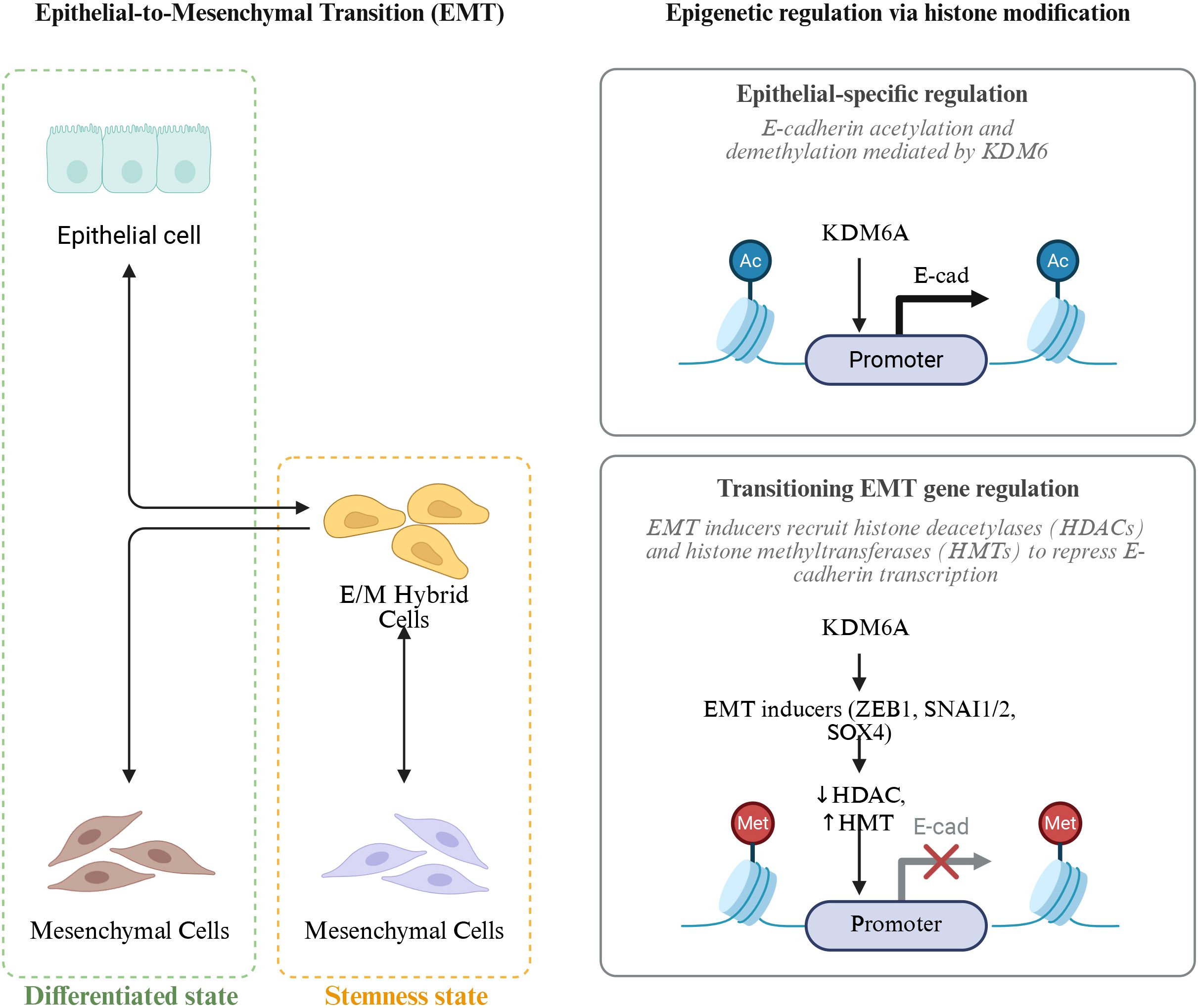 Figure 5. Epigenetic regulation of epithelial-to-mesenchymal transition (EMT) via histone modification. EMT is a dynamic process in which epithelial cells acquire mesenchymal features through intermediate E/M hybrid states, balancing differentiation and stemness. Histone modifications play a key role in this transition: KDM6A mediates E-cadherin (E-cad) acetylation and demethylation to maintain epithelial identity, whereas EMT inducers (ZEB1, SNAI1/2, SOX4) recruit histone deacetylases (HDACs) and histone methyltransferases (HMTs) to repress E-cad transcription, promoting mesenchymal conversion and enhanced cellular plasticity.AC (Acetylation).