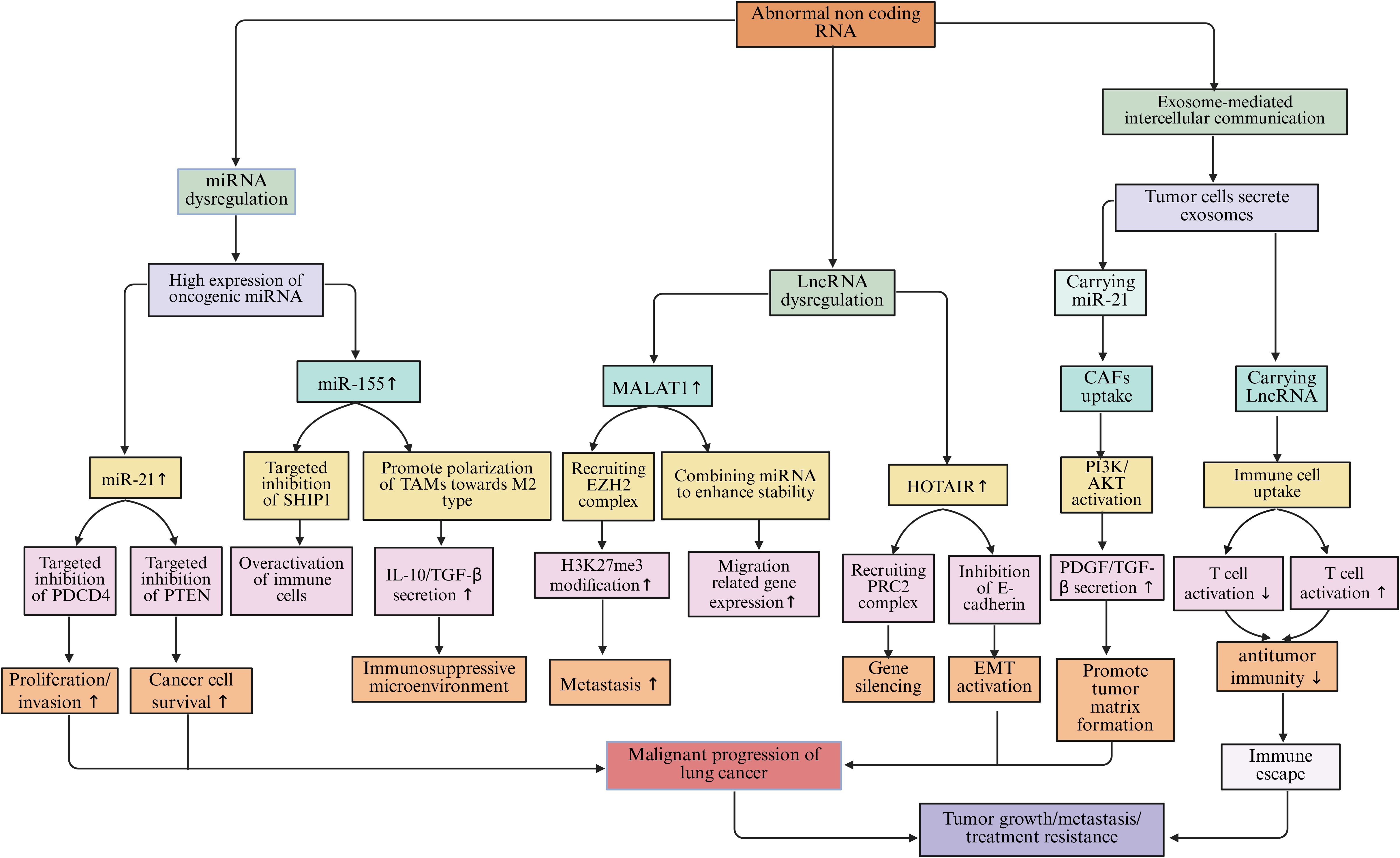 Non-coding RNA refers to a category of RNA molecules that do not translate into proteins, yet they serve an essential regulatory function within the microenvironment of lung cancer. This category predominantly encompasses miRNA and lncRNA. These molecular entities modulate gene expression at both transcriptional and post-transcriptional stages through their interactions with specific target genes. Consequently, they impact the biological activities of lung cancer cells as well as the cellular communication and interactions occurring within the lung cancer microenvironment.