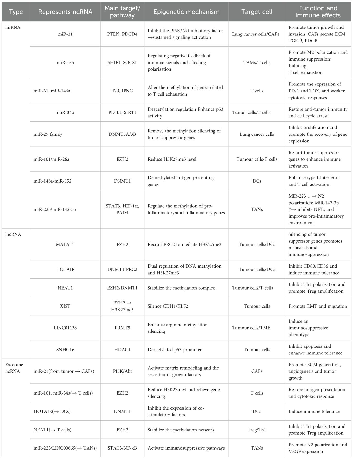 Non-coding RNAs play a key role in intercellular communication within the lung cancer microenvironment. Tumor cells can transfer their ncRNAs to surrounding cells through the secretion of exosomes, thereby affecting their functions (247). Lung cancer exosomes contain a large amount of miRNAs and lncRNAs, which can be taken up by CAFs and immune cells (248). Exosomal miR-21 can be taken up by CAFs, activating the PI3K/Akt pathway, leading CAFs to secrete more extracellular matrix and pro-tumor factors (such as TGF-β, PDGF), providing a more favorable growth environment for tumor cells (249). Meanwhile, ncRNAs carried by exosomes, such as miR-29, miR-101, MALAT1, and HOTAIR, can directly regulate epigenetic modifications in recipient cells. For example, in T cells, exosomal miR-214 and miR-24-3p inhibit signaling transduction and methylation regulation by targeting PTEN/DNMT1, inducing the expression of exhaustion genes (PDCD1, TOX); while miR-34a and miR-101 downregulate EZH2 and reduce H3K27me3, partially restoring cytotoxic activity (250). In DCs, exosomal HOTAIR recruits DNMT1 to inhibit CD80/CD86 and IL-12, inducing immune tolerance; while miR-148a/152 inhibits DNMT1 to promote antigen presentation and type I interferon secretion (251). In TANs, exosomal miR-223 and LINC00665 activate the STAT3/NF-κB pathway, driving N2 polarization and enhancing VEGF and IL-10 expression; conversely, miR-142-3p downregulates PAD4 to inhibit NETs formation, improving the pro-inflammatory immune environment (252) (Table 2, Figure 7).
