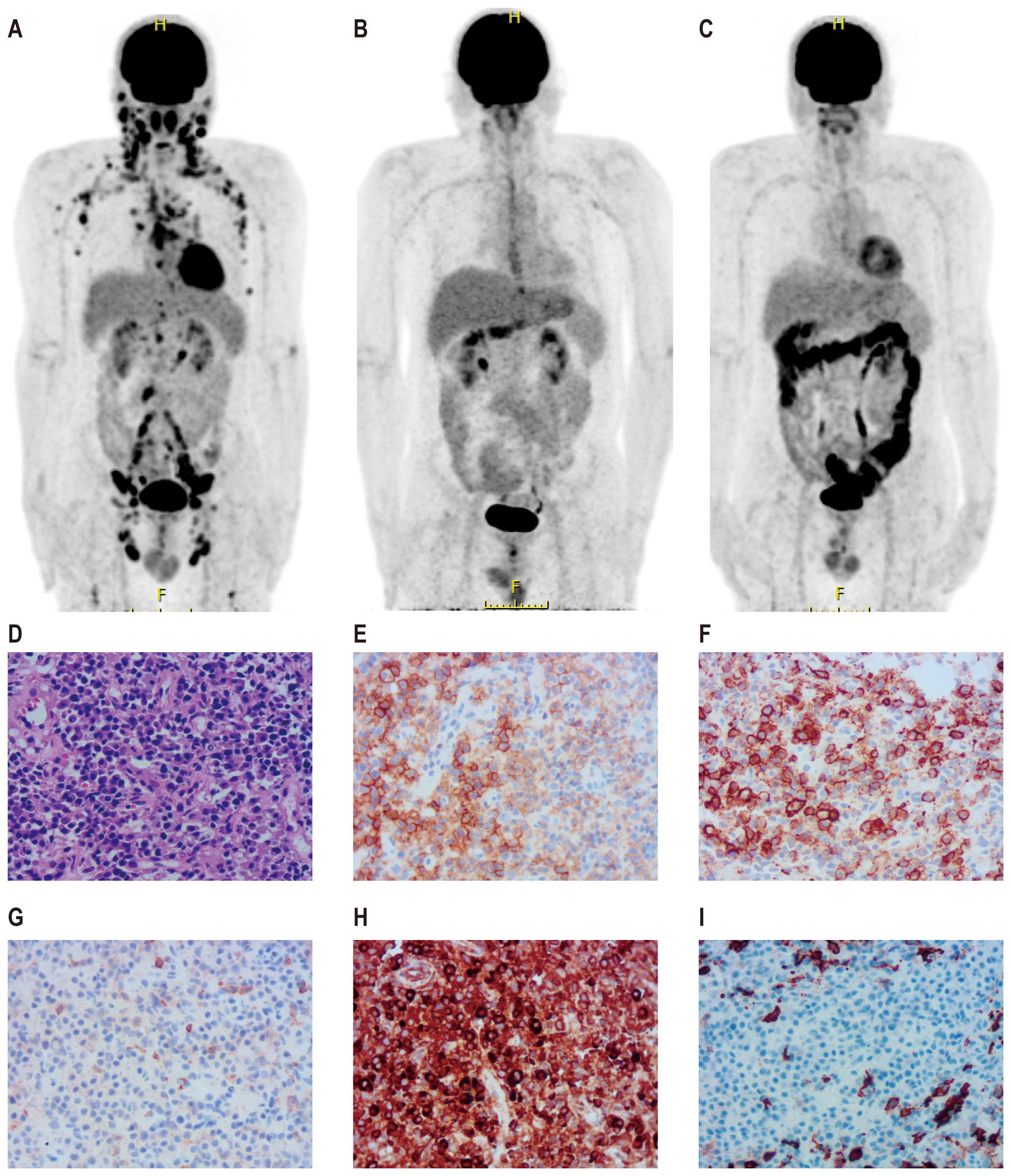 Figure 1. PET-CT images and biopsy of lymph node of a patient with plasmablastic lymphoma. Pre-treatment PET-CT (A), PET-CT after four cycles of first-line therapy (B), and PET-CT three months after CD19 and CD22 CAR-T treatment (C). A biopsy of the right pelvic mass was conducted prior to CAR-T therapy. Wright–Giemsa staining revealed abnormal cells characterized by diffuse proliferation and infiltration, large size, abundant cytoplasm, round or slightly irregular nuclei, prominent central nucleoli, and frequent mitotic figures (D). Immunohistochemical analysis demonstrated that tumor cells were positive for CD38 (E), CD138 (F), CD19 (G), and CD22 (H) and negative for CD20 (I).
