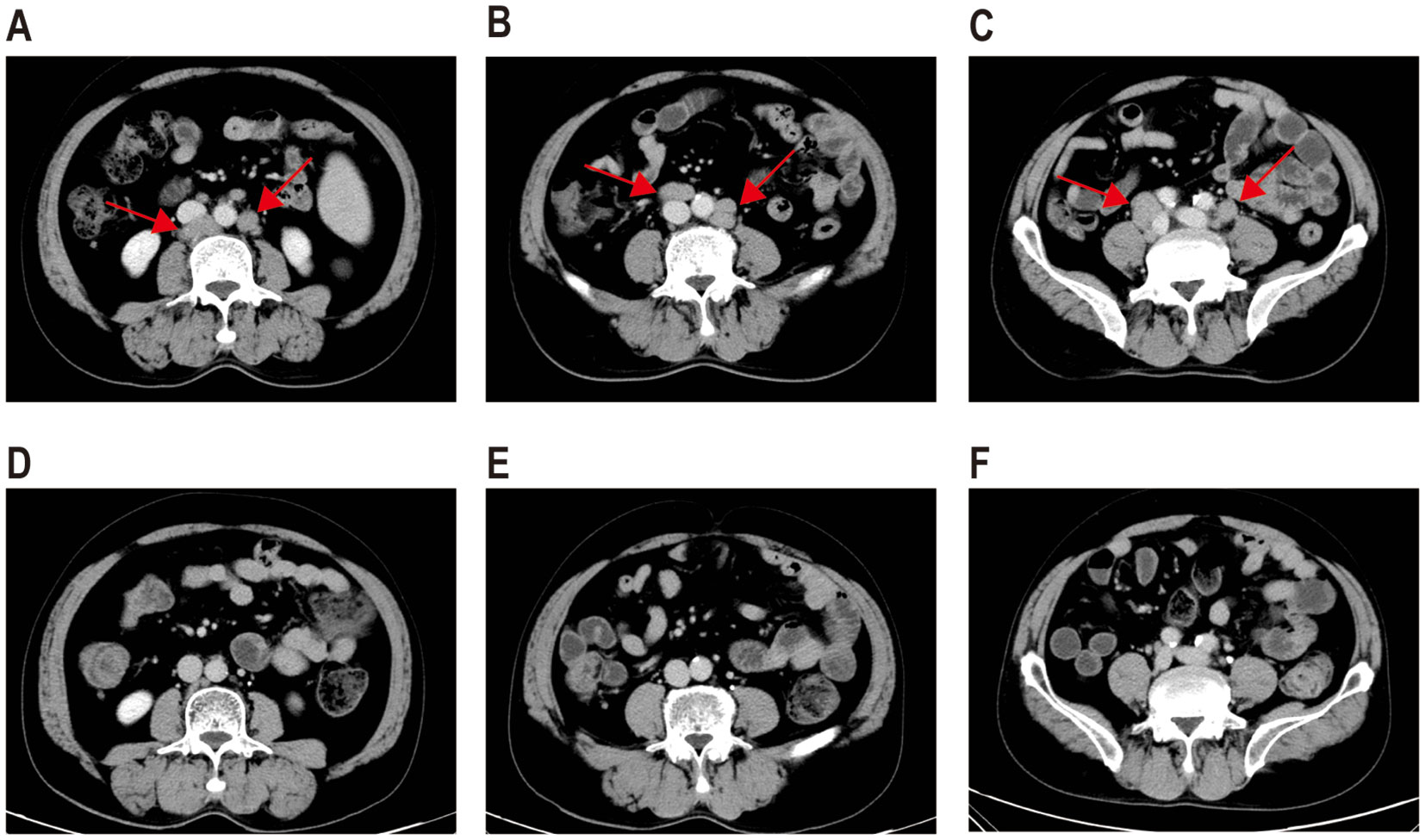 Figure 2. CT images before and after CAR-T therapy. CT scans following two cycles of daratumumab in combination with GemOx showed no treatment response (A–C). One month after the transfusion of CD19 and CD22 CAR-T cells, the patient achieved a complete response (D–F).