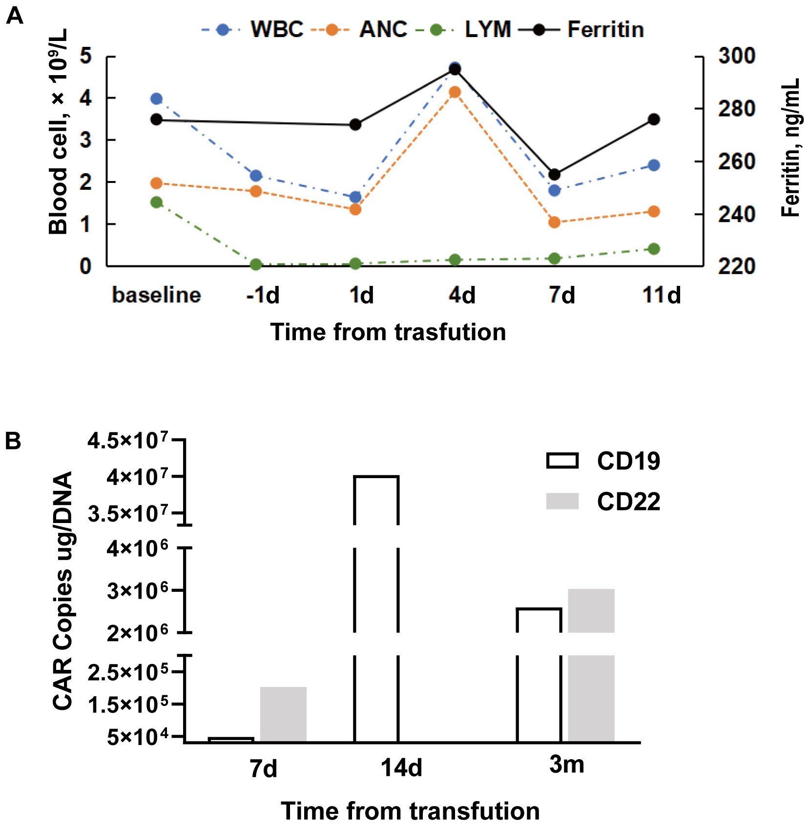 Figure 3. Blood cell counts, ferritin, and CAR copies during CAR-T therapy. (A) Ferritin (ng/mL), leukocyte (×109/L), neutrophil (×109/L), and lymphocyte (×109/L) at baseline (prior to chemotherapy of fludarabine and cyclophosphamide) and following CD19 CAR-T cell transfusion. (B) CD19 and CD22 CAR copy numbers post-infusion. (CD22 CAR copy data could not be obtained as scheduled on day 14 following infusion because of the patient’s discharge from the hospital). WBC, white blood cell count; ANC, absolute neutrophil count; Lym, lymphocyte count.